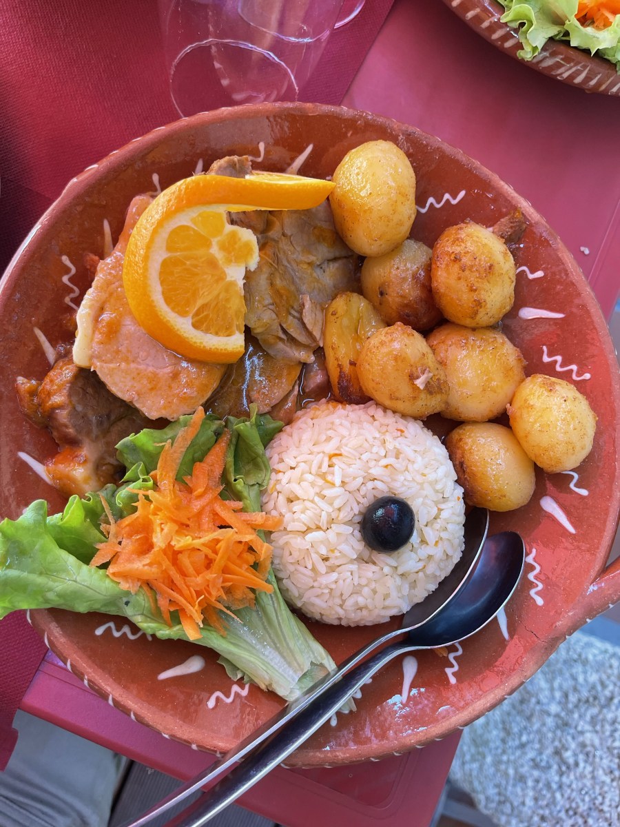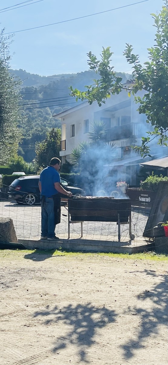 På vår promenad stöter vi på en restaurang där kocken står utomhus och grillar till lunchen. Vi bestämmer oss genast för att äta där.