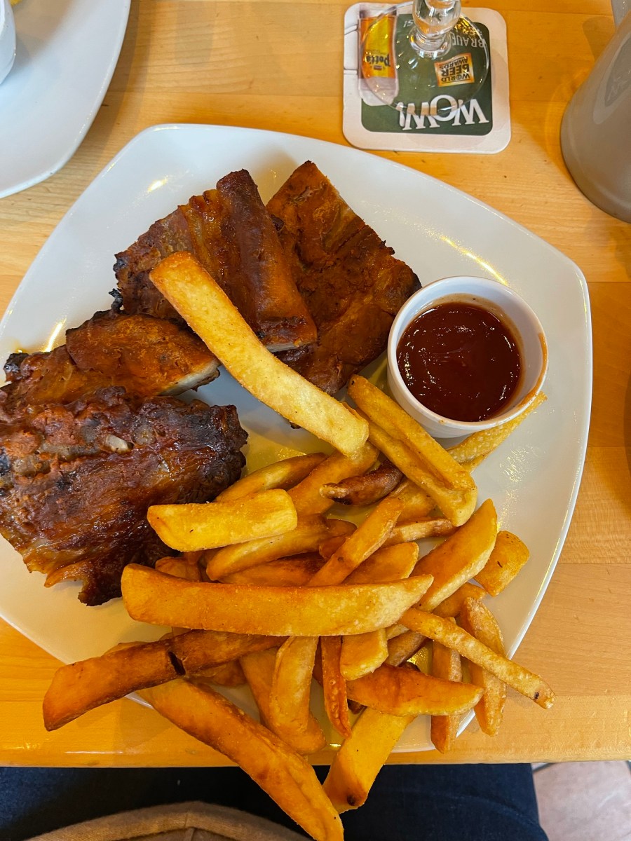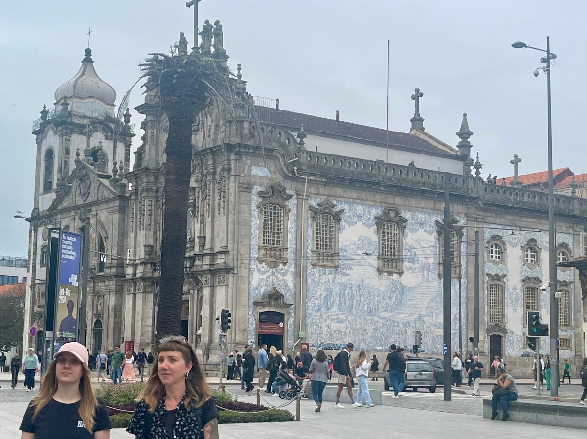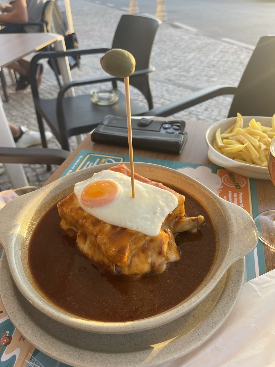 På kvällen går vi 3-400 metrarna till centrum och äter middag. T beställer ”francesinha”, en lokal rätt från Porto. Den innehåller bröd, biff, lokala korvar, skinka, ägg, ost, bröd igen, ytterligare ett stekt ägg – liggande i en djup tallrik med kryddig köttsås. Till det – en tallrik utmärkta pommes frites… därefter paltkoma…🤣