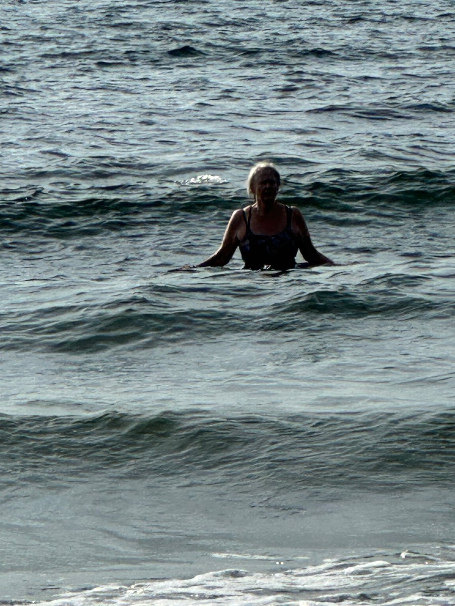 Enorma vågor slår in, vi nöjer oss med att doppa tårna, men ack så härligt det är här!