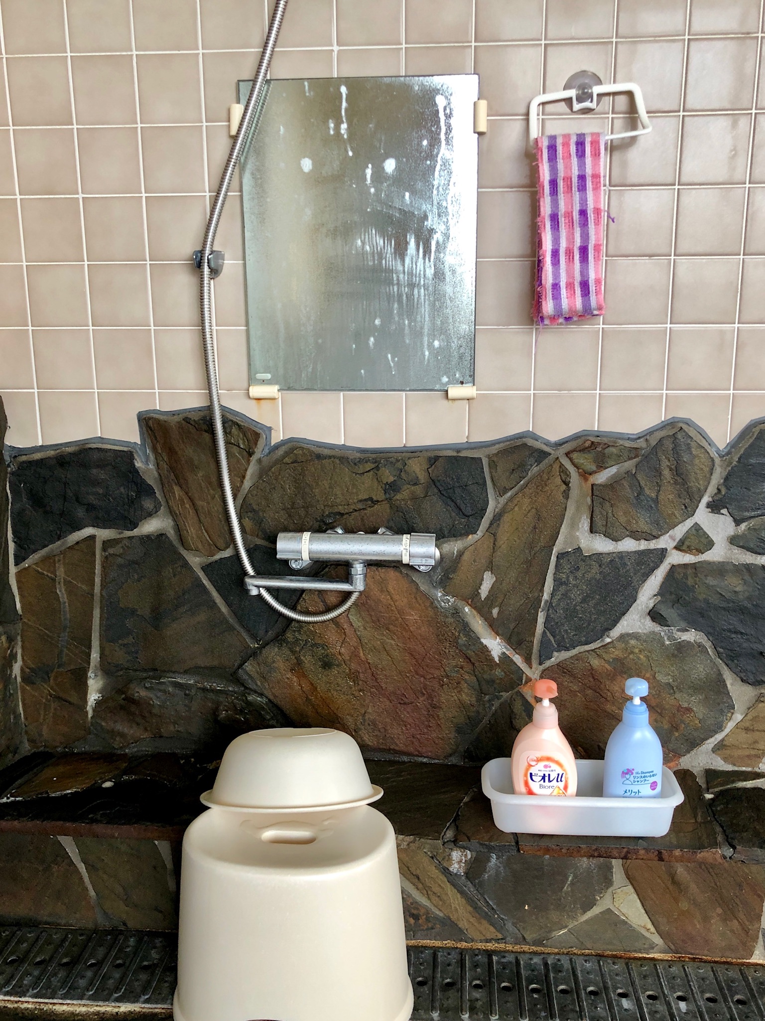 Man sätter sig vid ”vattenstationen” på en pall, tappar upp hett vatten i en bunke, duschar av sig eller häller hett vatten över kroppen från bunken (skönast!), löddrar in sin tvättlapp och börjar skura. Från topp till tå och om igen. När du är redo för att gå ner i bassängen, sätter du upp ditt hår om det behövs, här är tvättlappen bra att ha igen att fästa upp med.