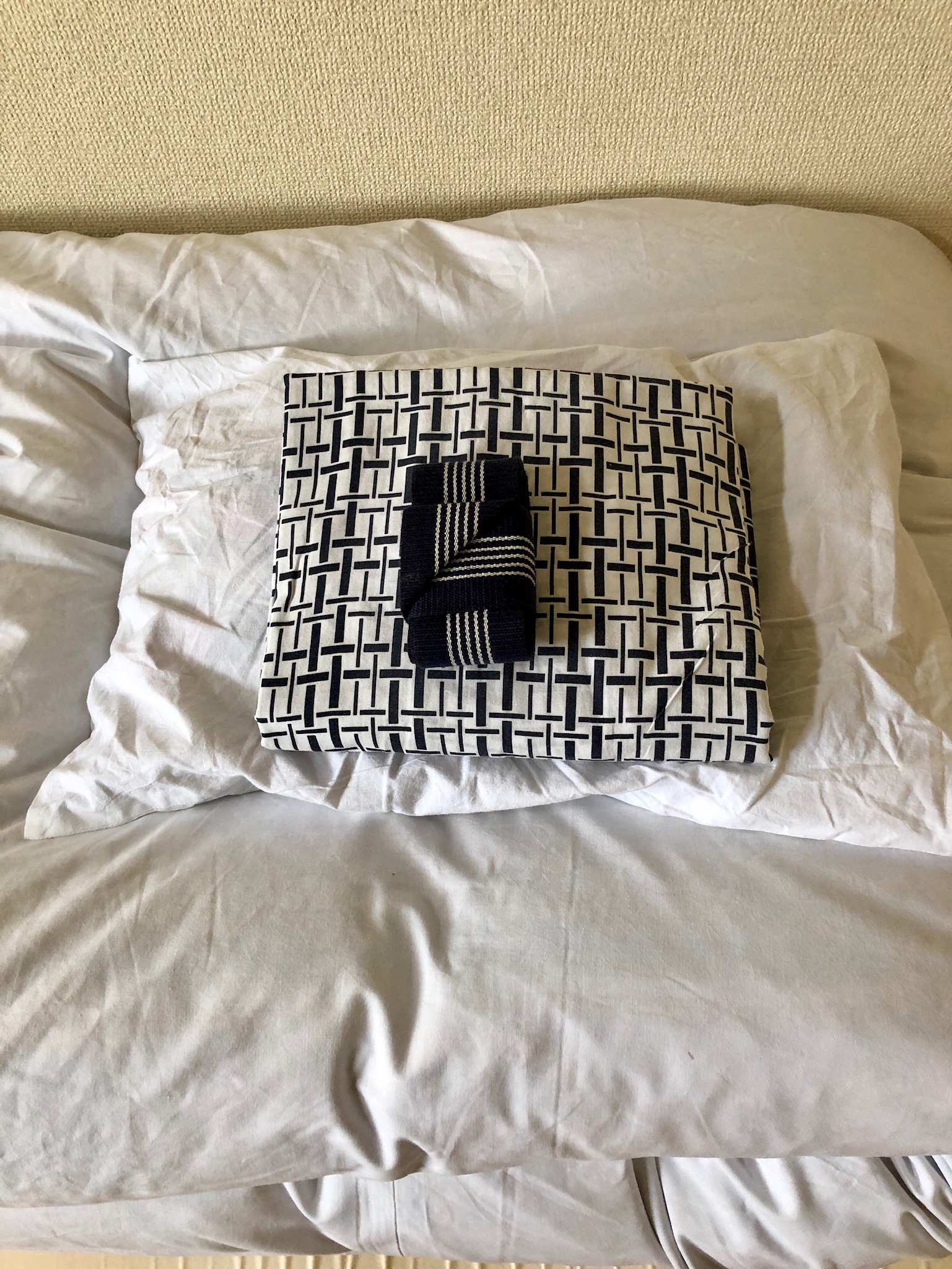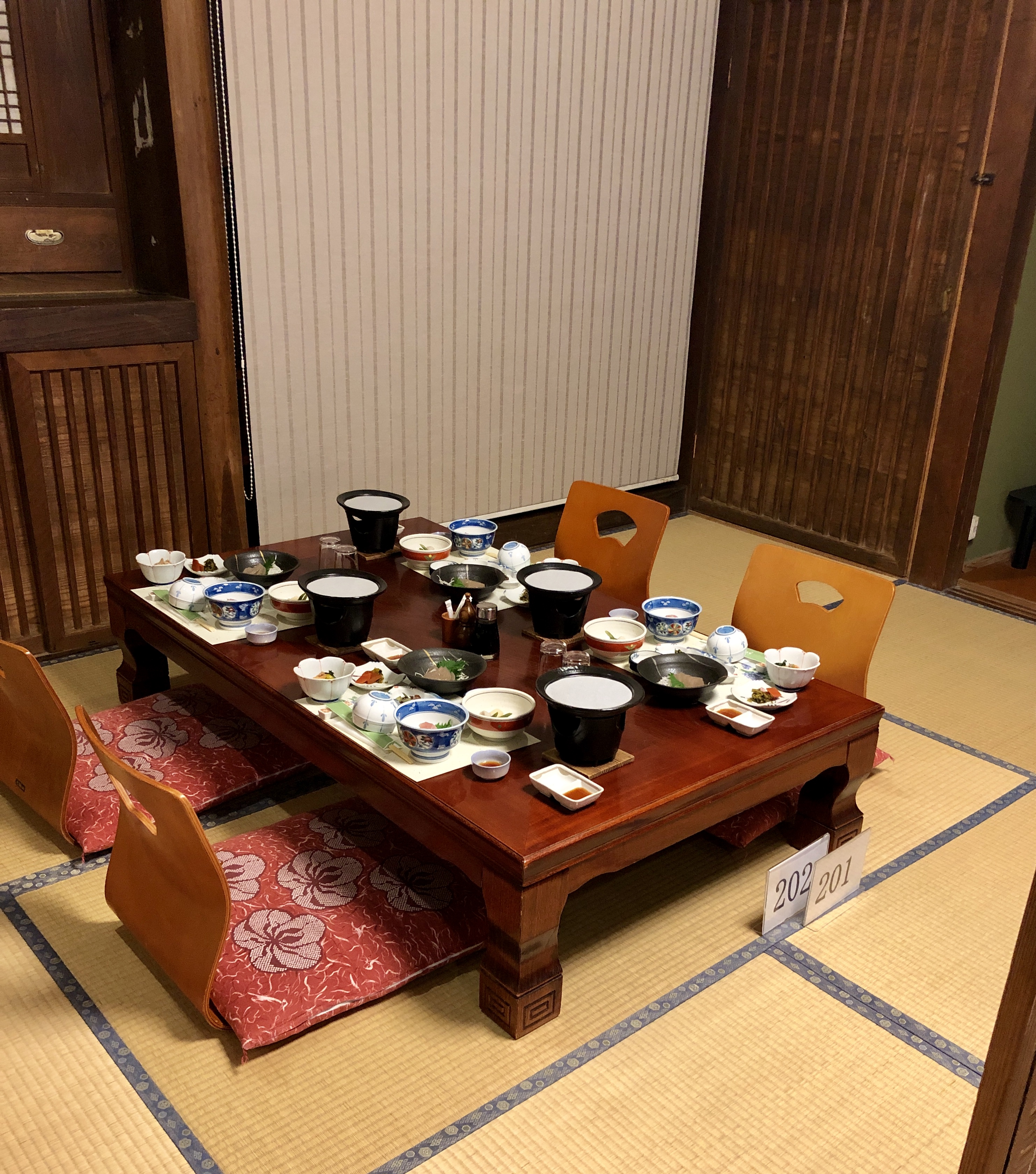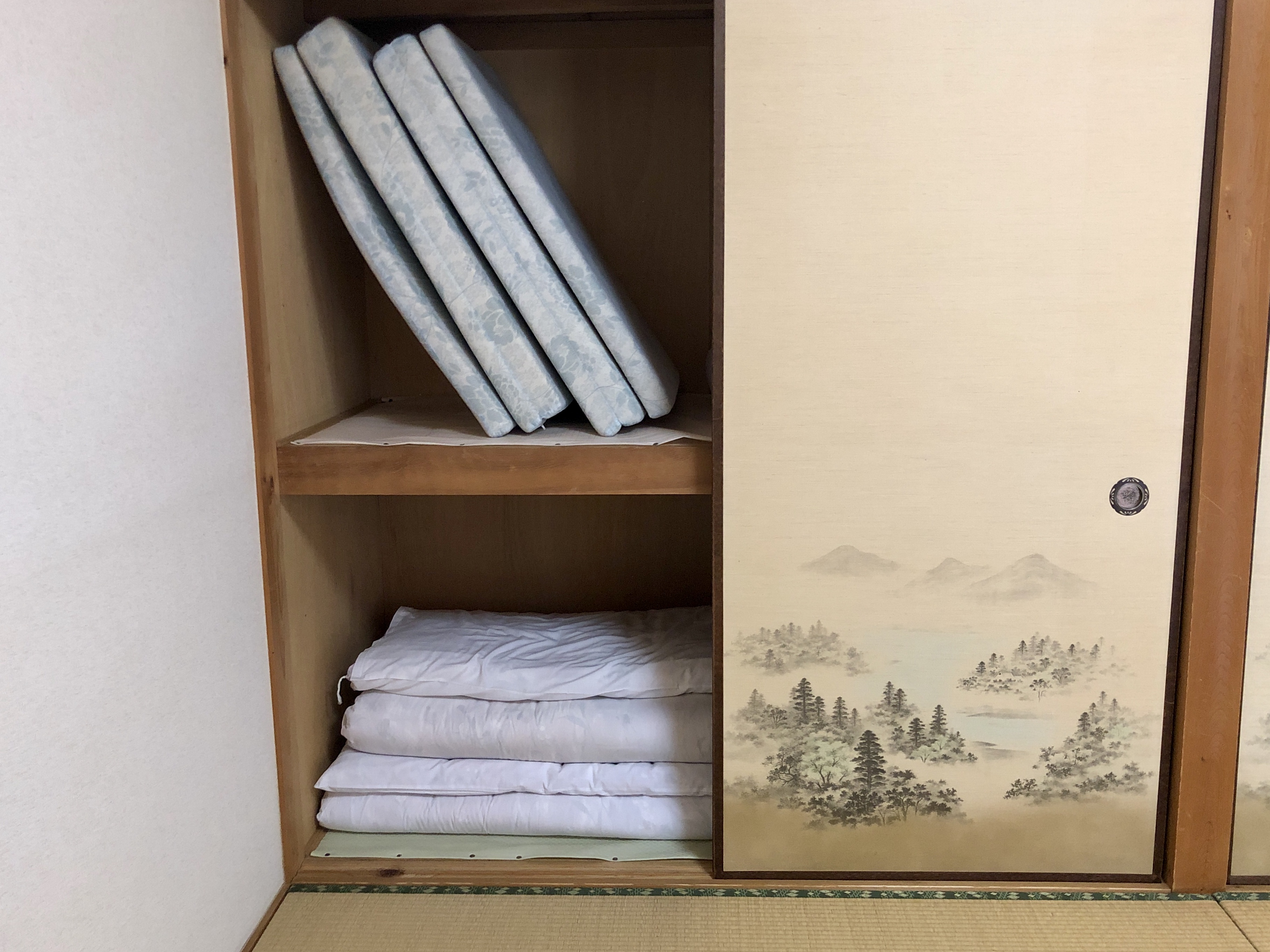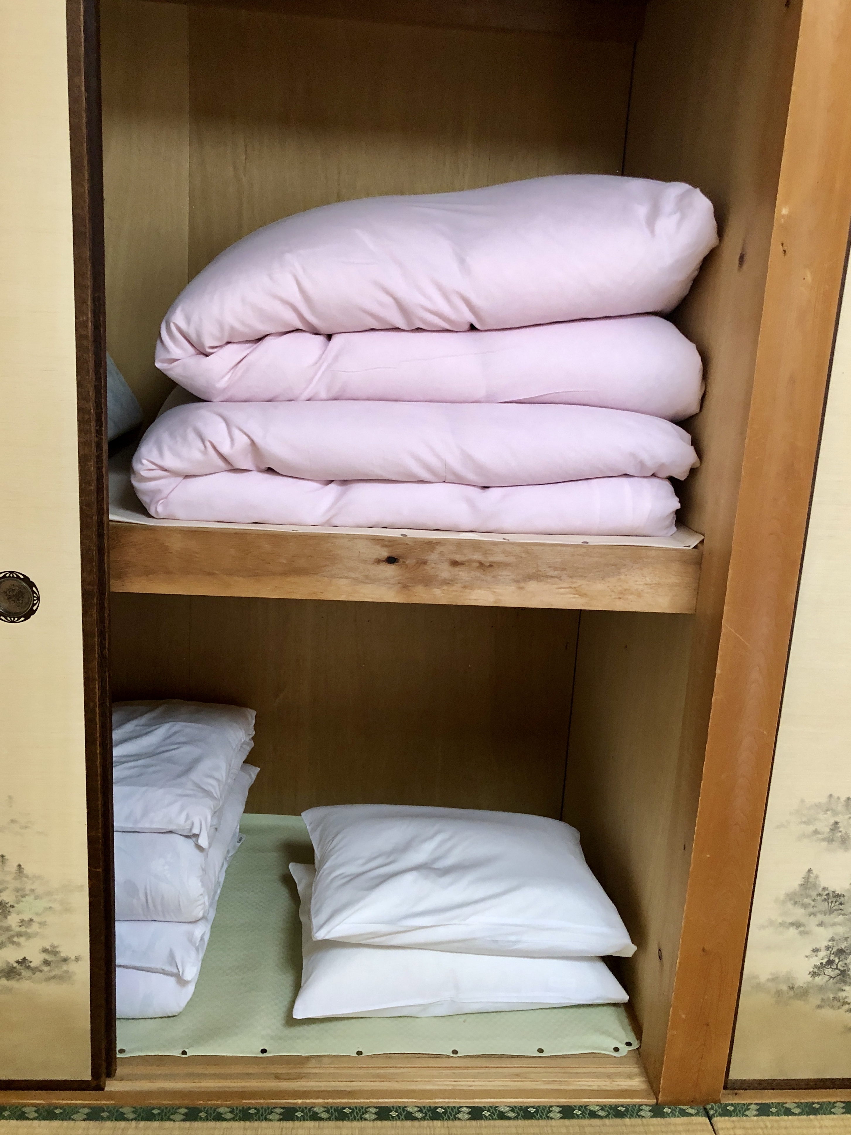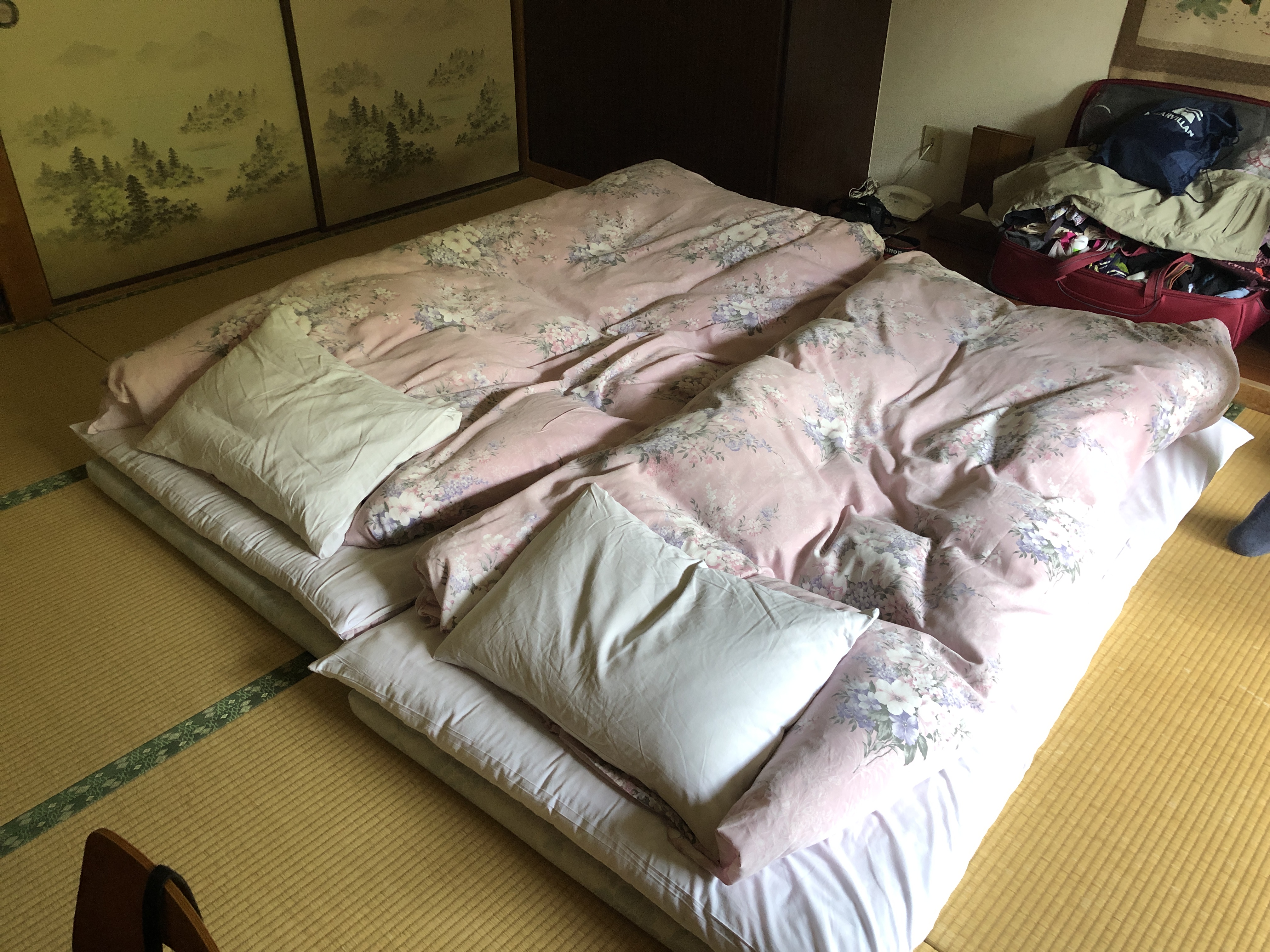 Bäddarna (futon) ligger ovanpå tatamimattor, vilka man inte får gå på med skor. Ett ”komplicerat” system med tofflor som står utställda här och där, skall nyttjas. Toatofflor t ex innanför dörren till toan. Svårt komma ihåg att ta av sig när man går ut från toan…