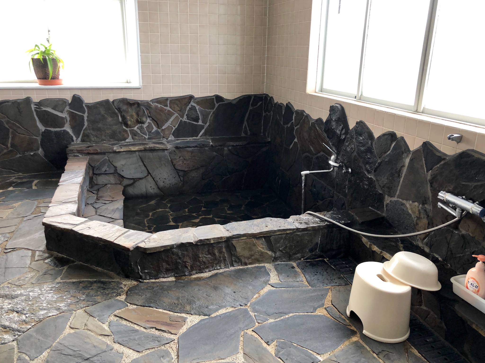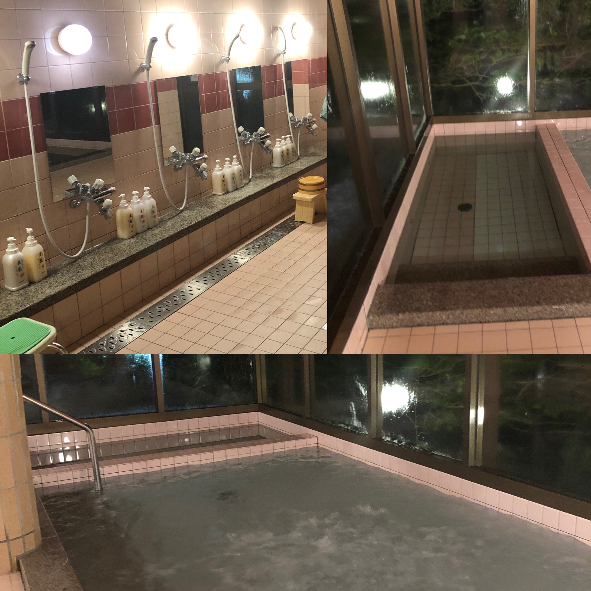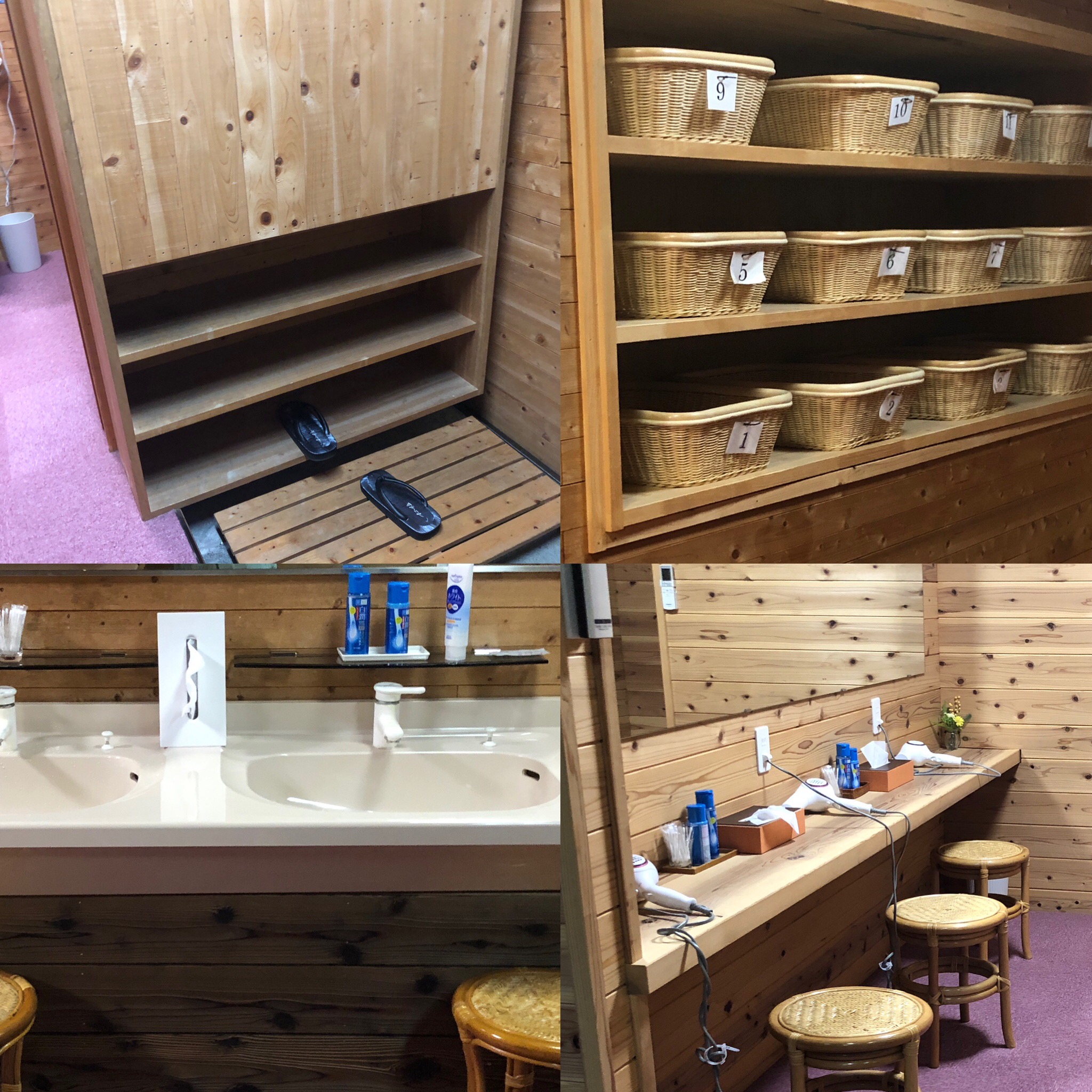 När vi väl kommit tillbaka till vandrarhemmet, tog Ammi och jag ett bad, liksom vi gjorde igår. Såå härlig badkultur det är i Japan! Först tvätta sig rejält med rivig tvättlapp och härlig duschtvål, skölja med handfat och dusch. Upprepa, och njut av det varma vattnet, sedan ligga i bassängen 41-42 gr varmt, så välgörande för alla leder och muskler, sen duscha/skölja sig igen i varmt/kallt vatten! Här några bilder från den fina ”dam”-avdelningen här på vandrarhemmet. Man byter om herr- och damsida varannan dag för omväxlingens skull (de är nog inte helt lika).
