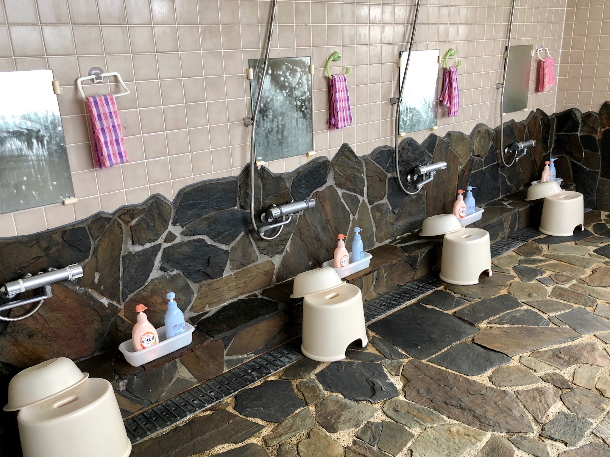 I onsen erbjuds allt som behövs för att kunna bada bekvämt. Tvättlappar, schampo, duschkräm, conditioner, tandborste och tandkräm, öronpinnar, hårband, kam och borste, hårtork, rakhyvel, raklödder och after shave etc. Mycket angenämt!
