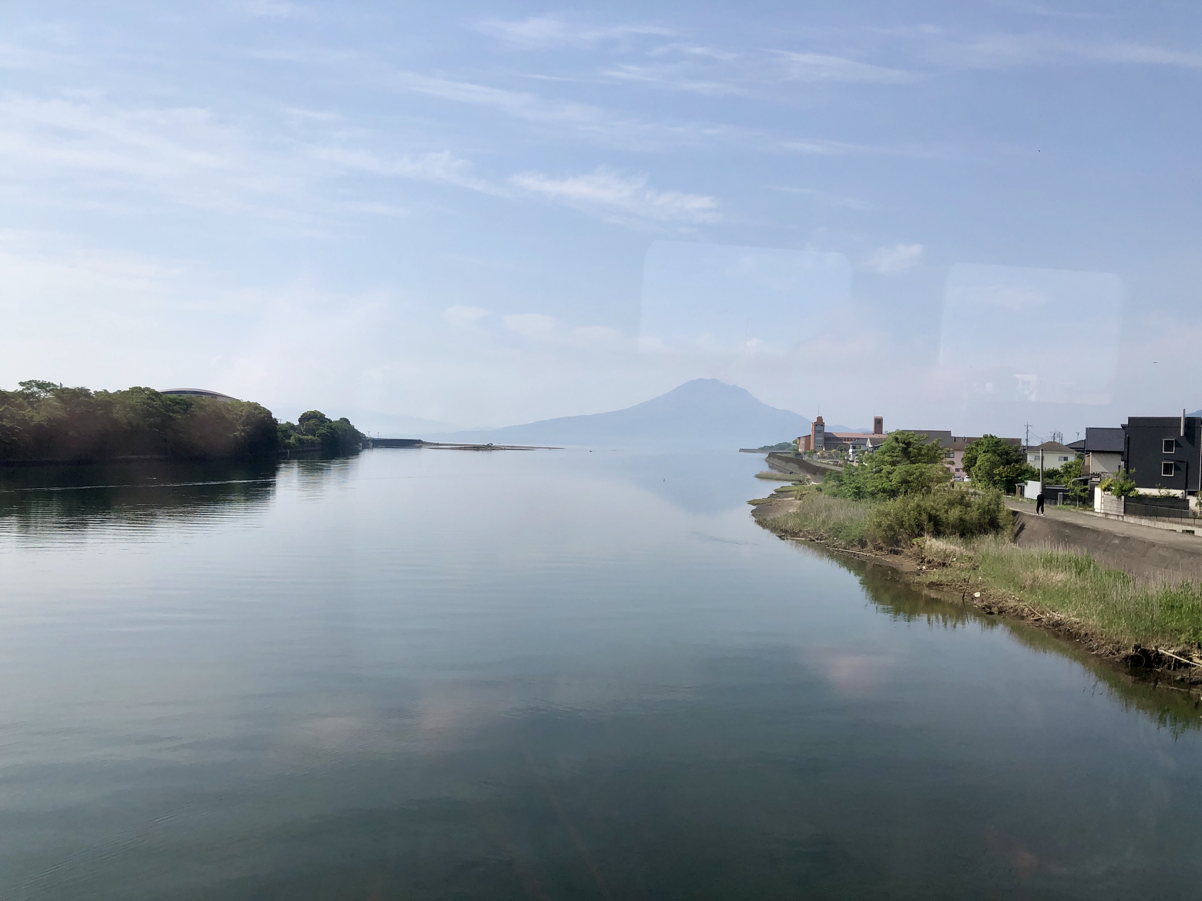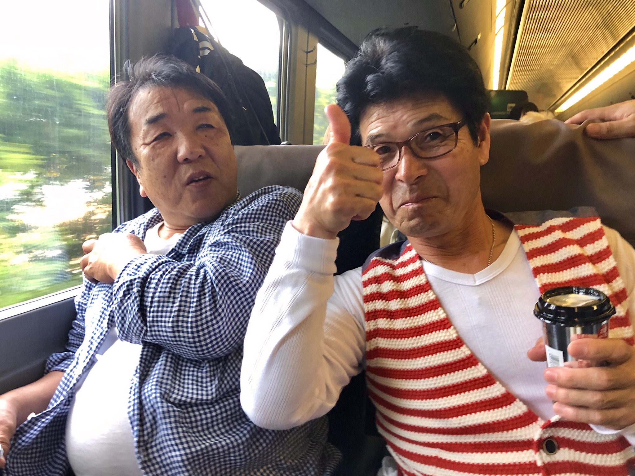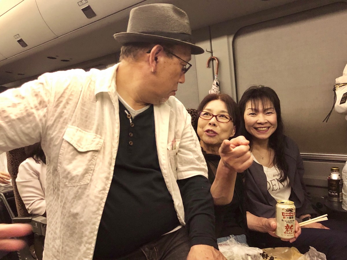 Vi tog tåget från Nagasaki Station tillbaka mot Fukuoka. Vid en station före Fukuoka, bytte vi till Shinkansen, höghastighetståget, mot Kirishima. Nu var vårt lokaltåg från Nagasaki försenat, och våra 6 minuter för byte hade försvunnit i tomma intet. Dock ”väntade” Shinkansen på anslutande passagerare, vi hade 2 minuter på oss att med allt vårt bagage rusa från den lägre plattformen upp till Shinkansens plattform som går högt över landskapet. Dessutom hade vi platser sista vagnen… herregud vad vi skenade! MEN det gick! dörrarna slogs igen bakom oss med ett pysande! Det var sannerligen ett äventyr! i Kagoshima bytte vi till lokaltåg igen, vårt mål var alltså Kirishima. Återigen hade vi ingen sittplats reserverad, och till följd av Golden Week var tåget så gott som fullt. Men vänliga människor klämde ihop sig och gjorde plats. Dessutom fick vi en synnerligen rolig resa med skojfriska intresserade japaner som bjöd på sig själva.