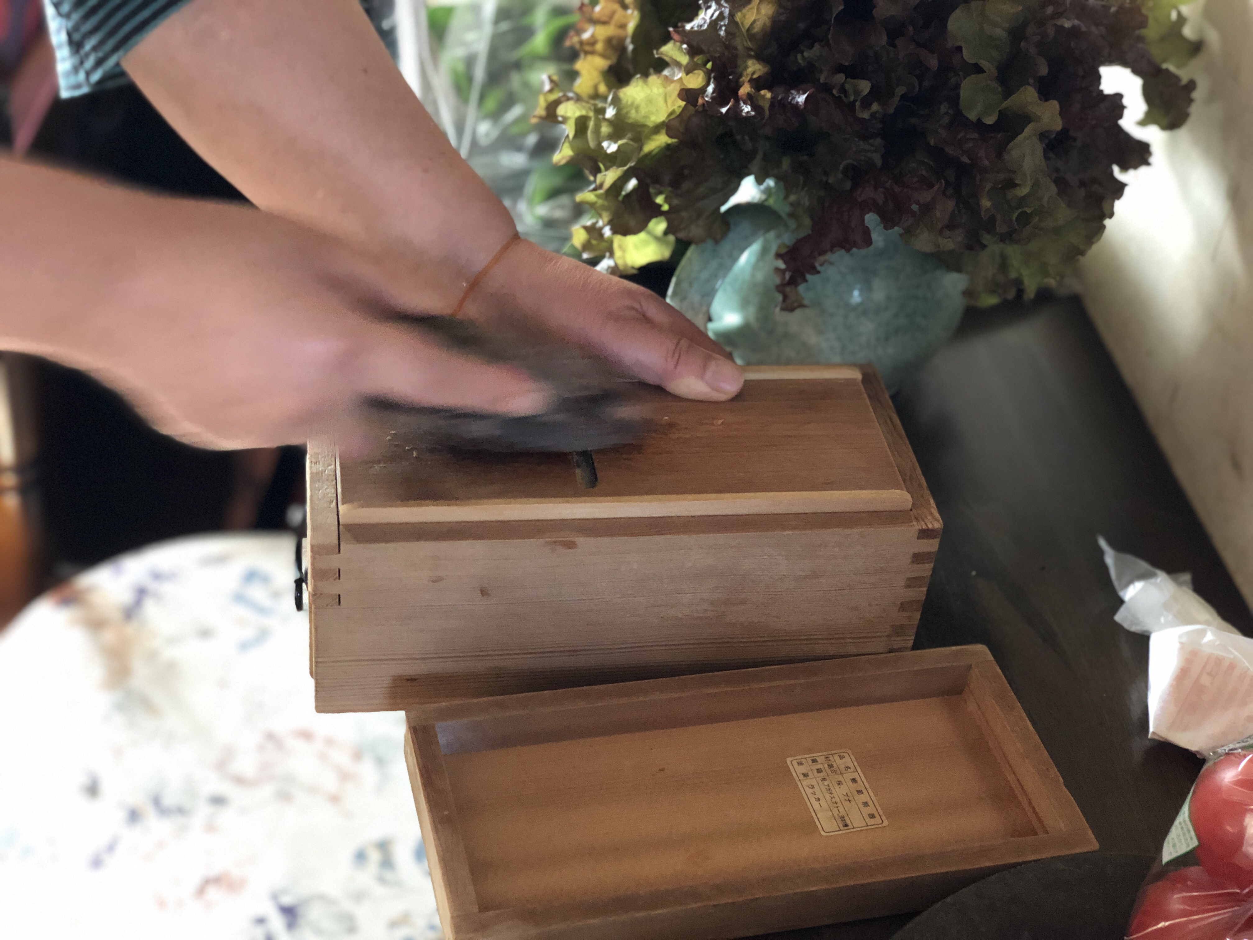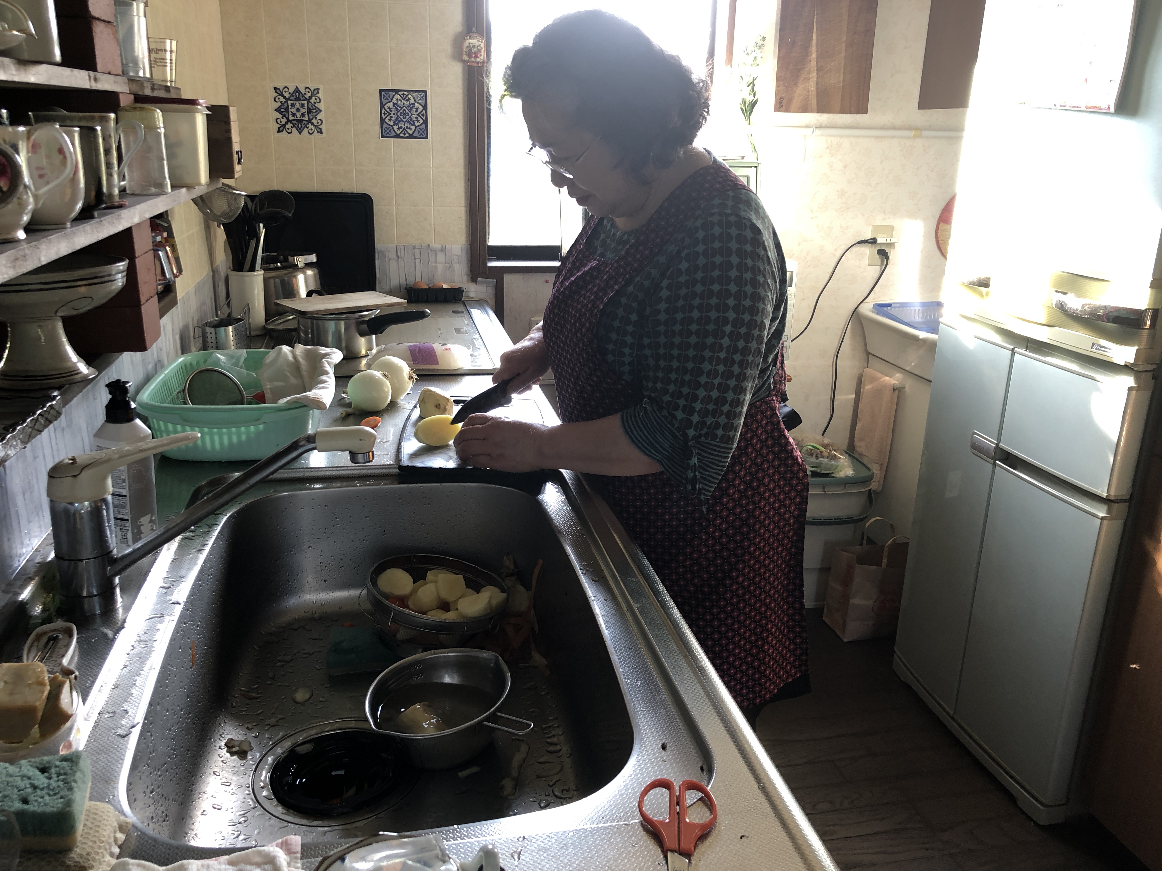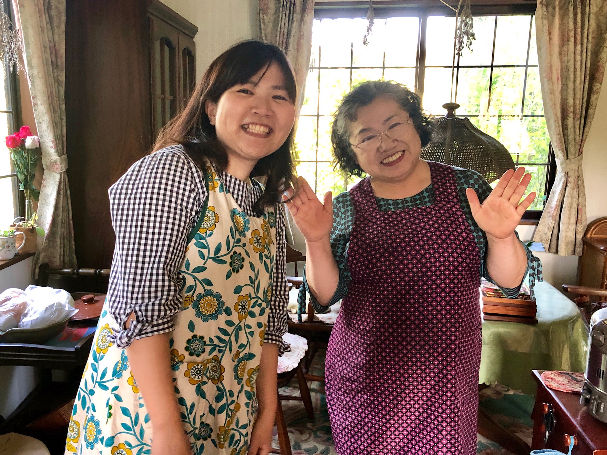Efter besöket på Sengan-En var det så dags ta adjö av vår fina guide Miyako. Hon lämnade över oss till Mrs och Mr Honda, som tog över ”ansvaret” för oss, de kommande två dagarna. Mrs Honda är van att ta emot gäster för ”homestay”. Eftersom vi uttryckt intresse för japansk matlagning, fick vi delta vid tillagningen av kvällens middag. Men först av allt fikade vi och åt Sakuramochi, en sötsak/kaka gjord av röd bönpasta (innuti) samt rispasta utanpå. Mild smak, med diskret sötma, samt dekorerad med körsbärsblad. Mrs Hondas vän (Nichko?) som talar hygglig engelska var med hela dagen och bistod.