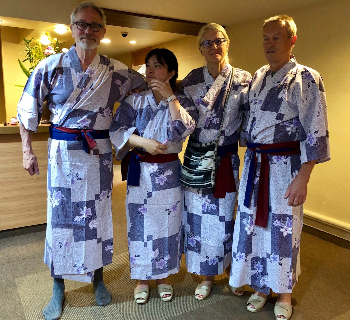 Därefter åker vi till vårt hotell, som denna gång är ett äkta onsen, dvs vattnet i badavdelningen kommer från underjorden och innehåller mineraler och luktar svavel. Det är lätt vitaktigt. Mycket nyttigt… Så fort vi checkat in och kommit upp på rummet, slänger vi på oss yukatan och rusar ner i badavdelningen. Åh så härligt! 4 inomhusbassänger av varierande storlek och innehåll, en utomhusbassäng, och en kallvatten”balja” samt en bastu. Sååå skönt för kropp och själ och för värkande leder. Mina fötter har börjat strejka, de vill inte riktigt vara med på att promenera 15 000- 20 000 steg om dagen (på varierande underlag) och det gör lite ont både här och där, såväl i knän som i höfter – så ett onsenbad är precis vad som behövs! Nåväl, vi hade haft så rysligt bråttom ner i badet, att vi missat att lägga märke till på vilken våning vi bodde, eller vilket rumsnummer vi hade! Och ”grabbarna” hade rumsnyckeln!