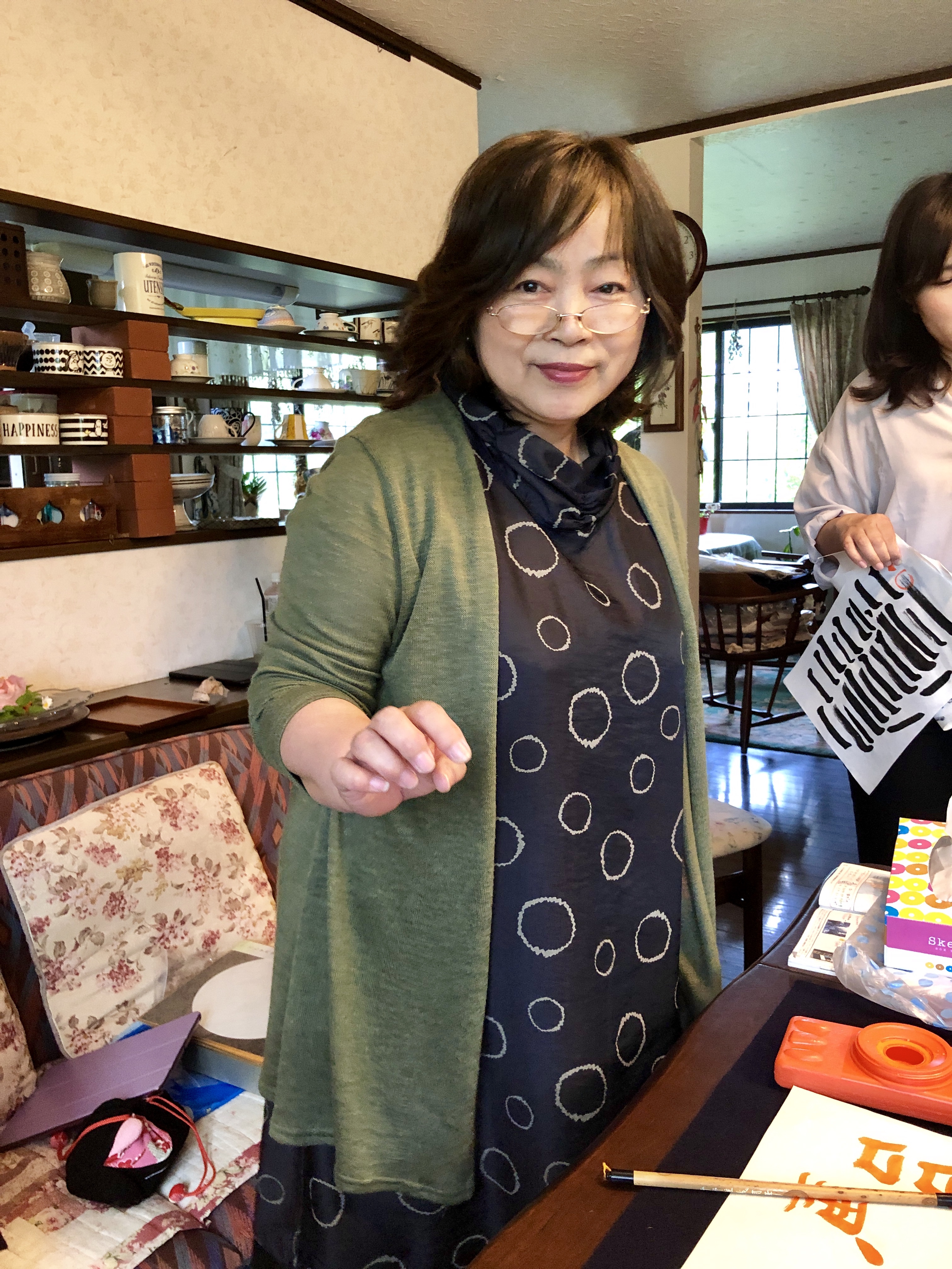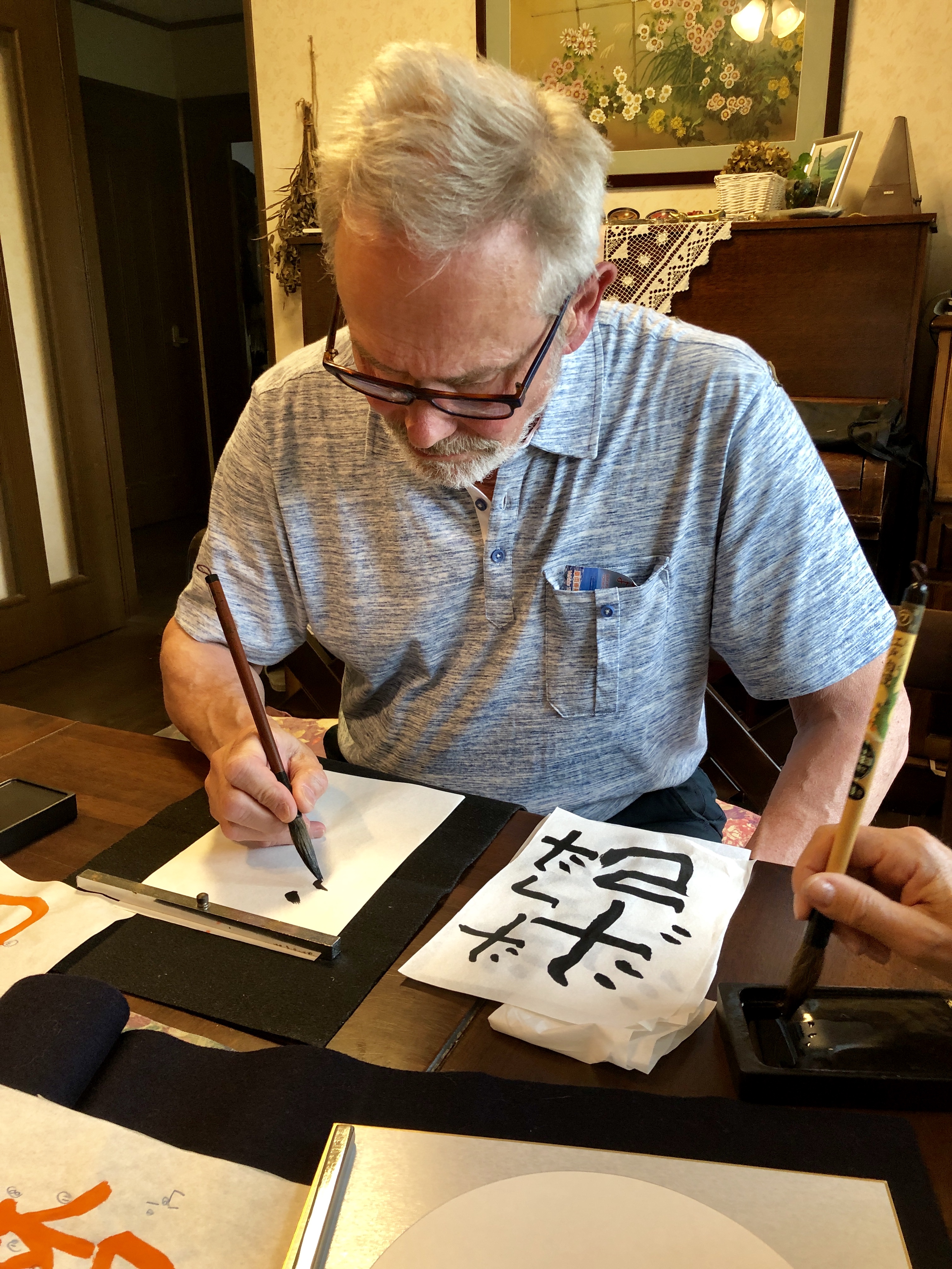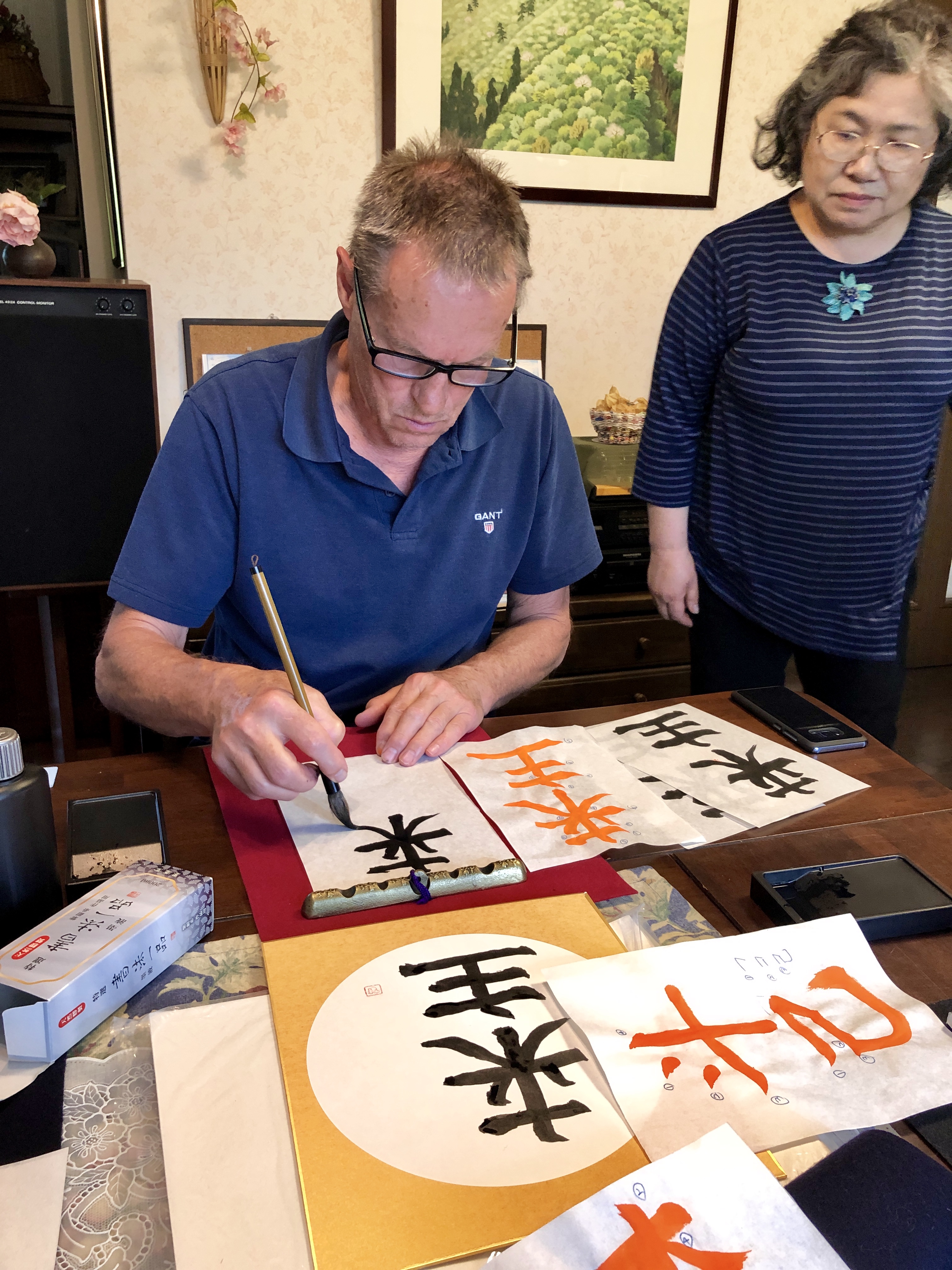 Sen var det dags att fara ”hem” för vår kalligrafilektion! Ytterligare en väninna till mrs Honda dök upp, förberedd med våra namn i kanji (ett av Japans tre skriftspråk med tecken lånade från kinesiskan) och utrustning för att kunna ge oss alla fyra en lektion. Vi kämpade väldigt hårt för att få till ett någorlunda resultat, men det var sannerligen inte lätt. Vi fick till och med rama in dem! Hur gulligt som helst!