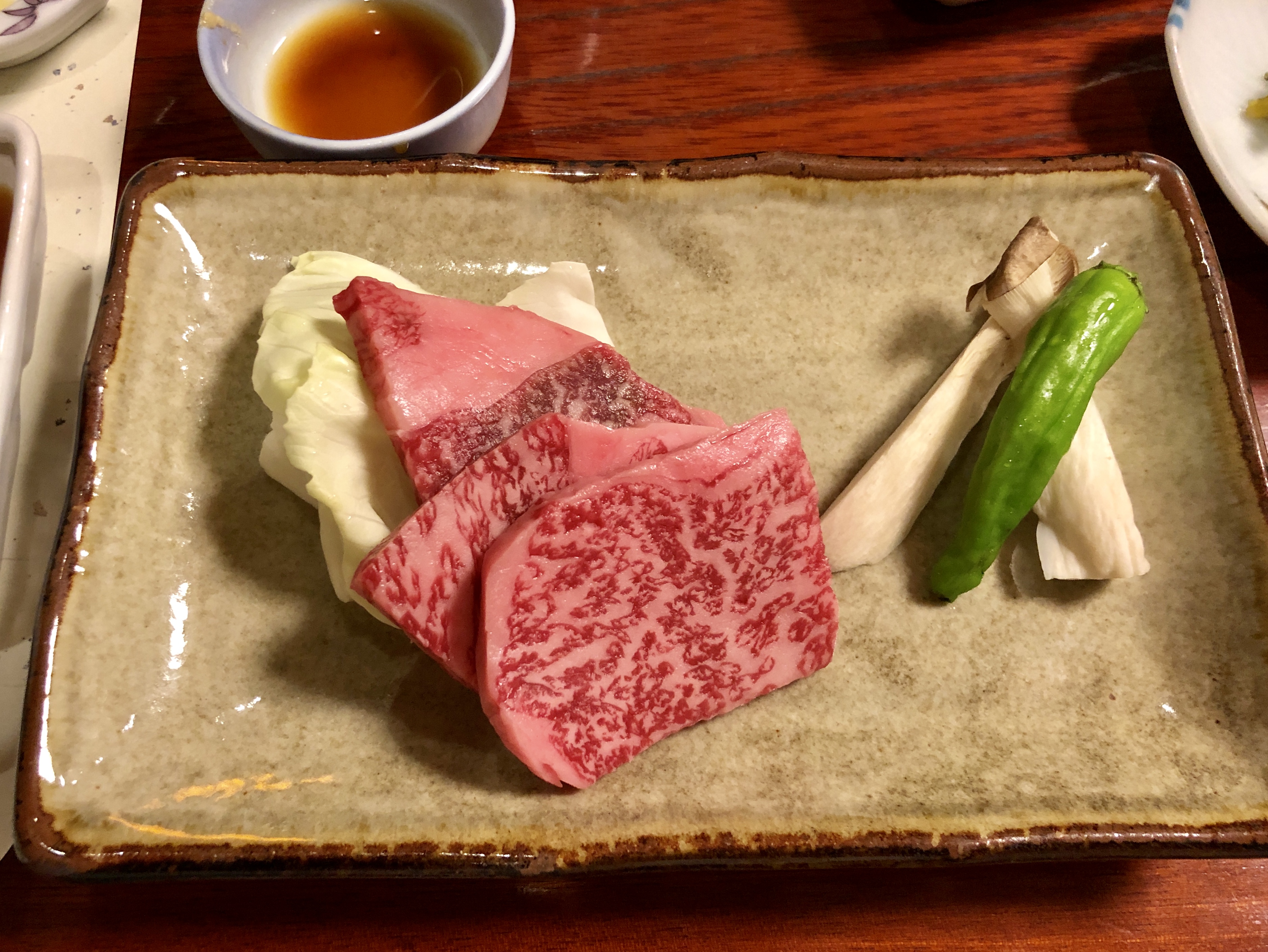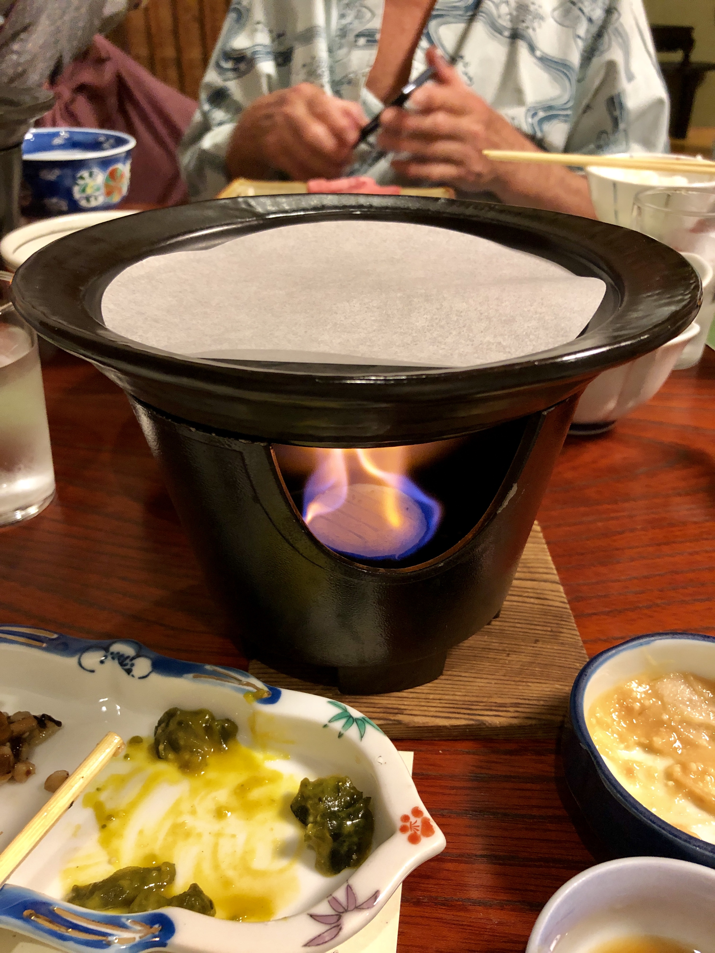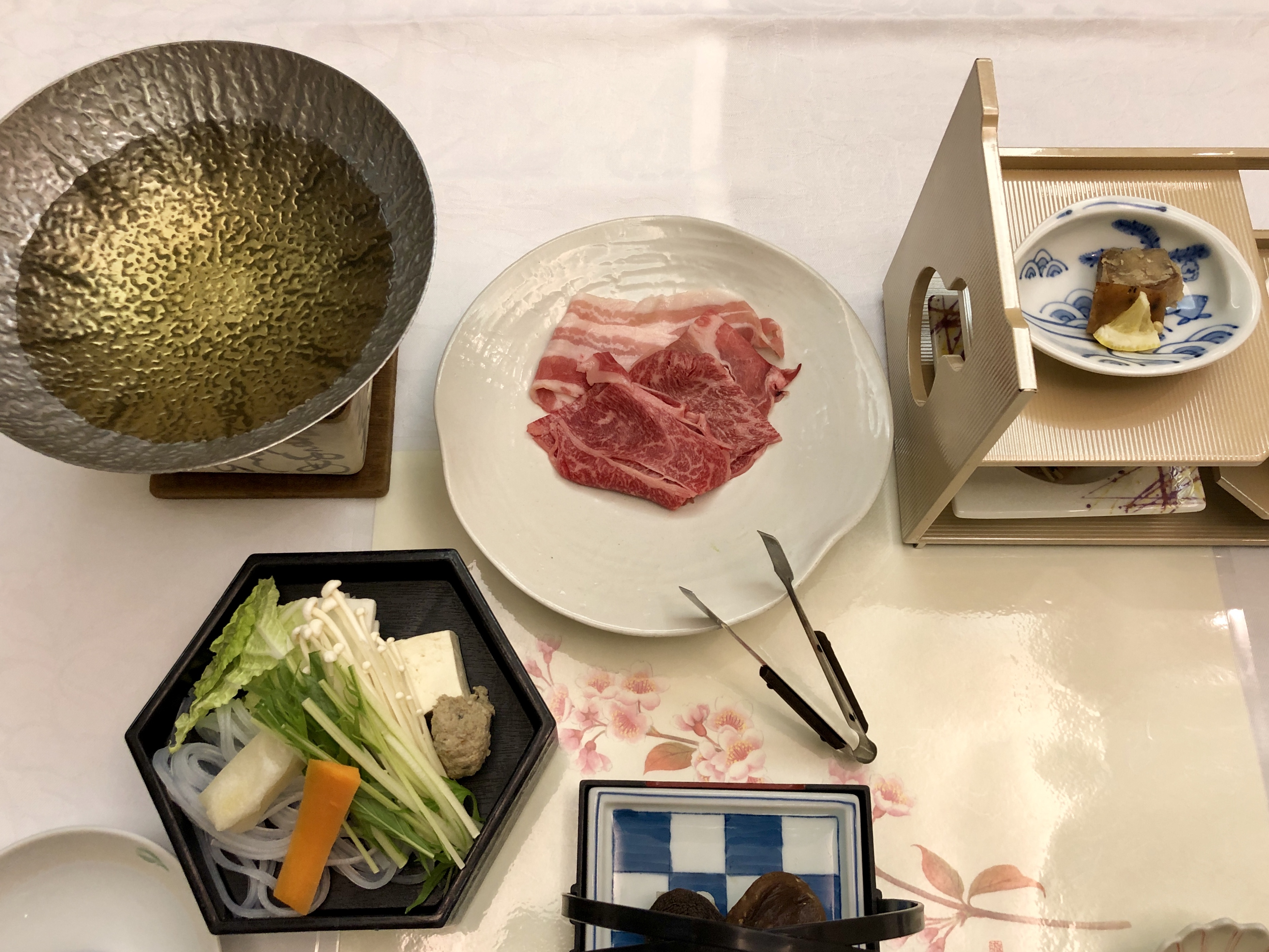 Solen sken hela dagen, det var lagom varmt och vi hade det jättefint. Efter vandringen ägnade vi oss så klart bad, och därefter ytterligare en 8-rättersmiddag, här sparar vi inte på något! Varje rätt är oerhört vackert presenterad, varje kuvert har en liten minikokplatta som man själv kokar sin sukiyaki t ex. Små smakbitar av allehanda slag, med ingredienser som i de flesta fall är okända för mig.