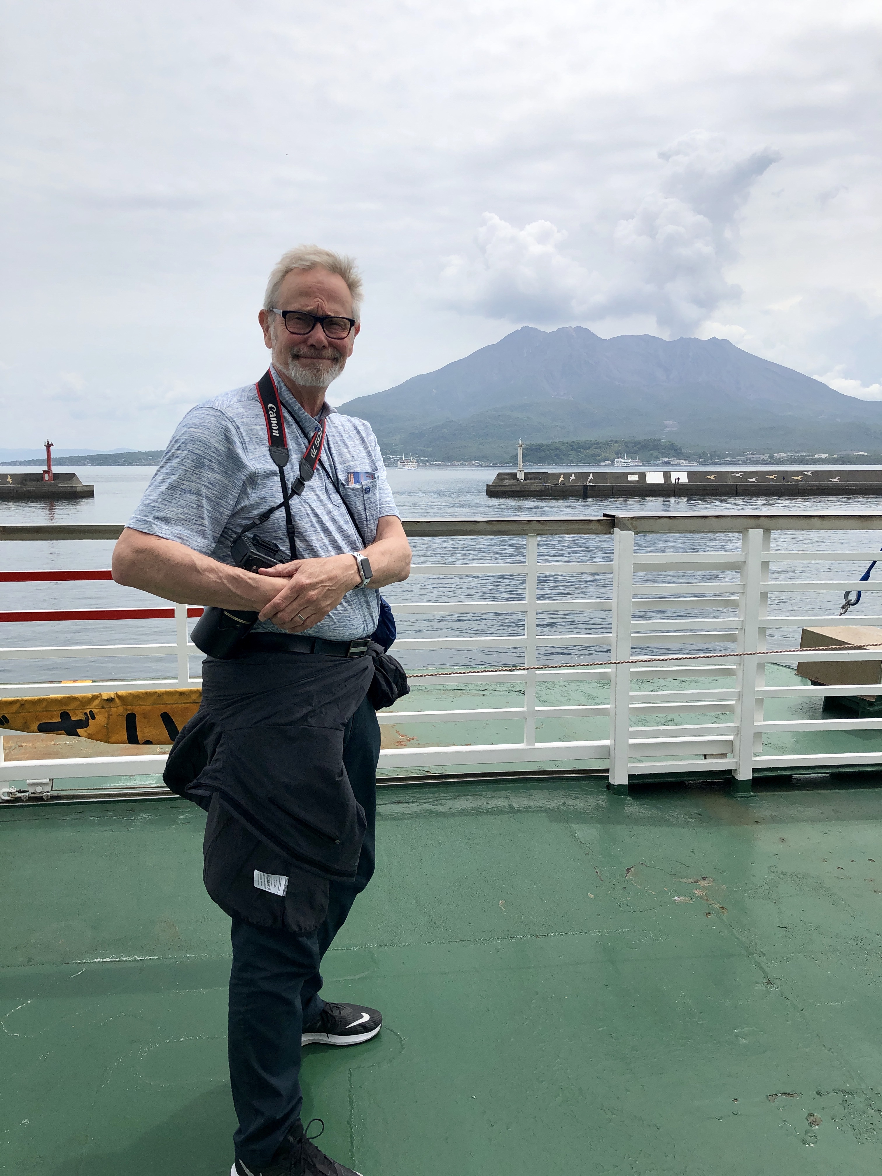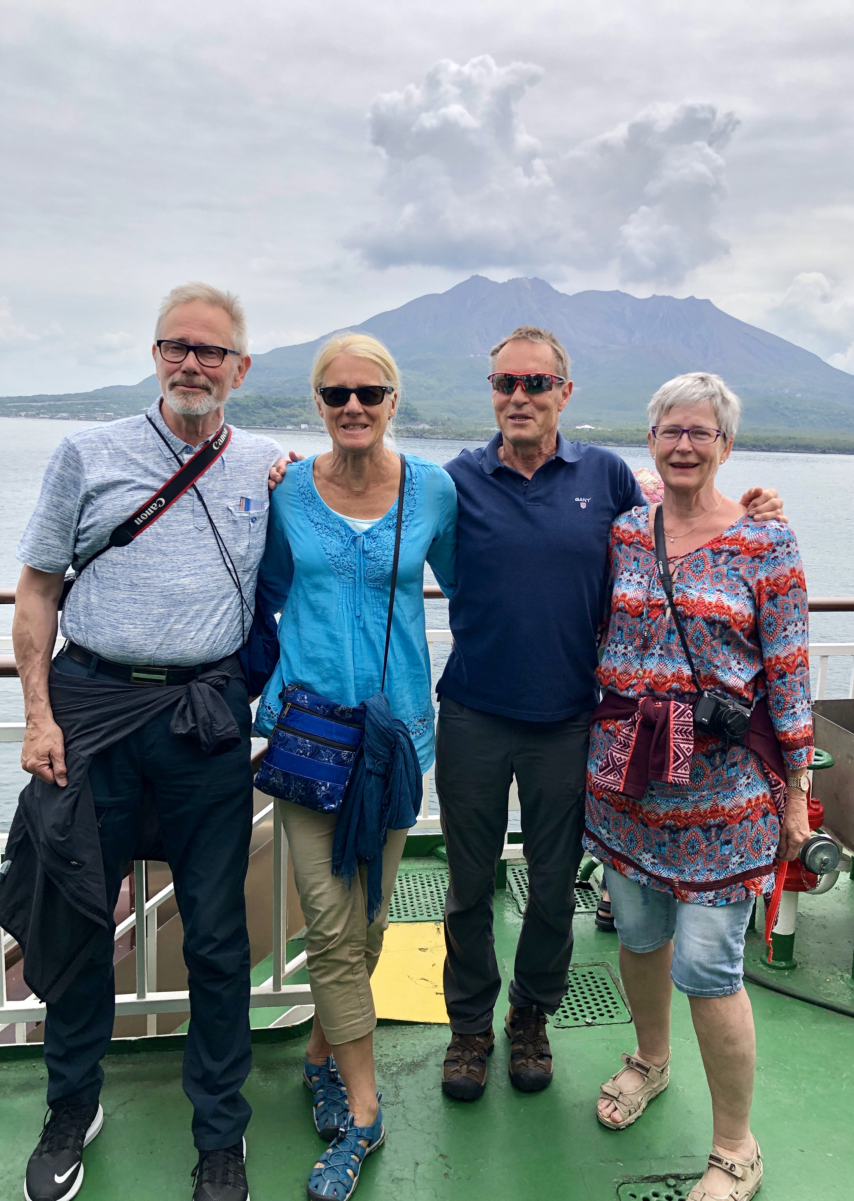 Herr och fru Honda hade planerat dagen för oss. De hade hyrt en fin Nissan Serena, 7-sitsig, inför vårt besök. Nu skulle vi besöka vulkanön, Sakurajima. Det är en strato-vulkan som belägen i bukten utanför Kagoshima, 1060 möh som högst. (Stratovulkaner är den vulkantyp som har de brantaste sidorna och oftast når de högsta höjderna. Det är också den vulkantyp som orsakar de farligaste utbrotten med dödliga konsekvenser. En annan känd stratovulkan är Vesuvius som begravde hela Pompeji i aska år 79. En stratovulkan får oftast sin lava från en lavakammare under marken).