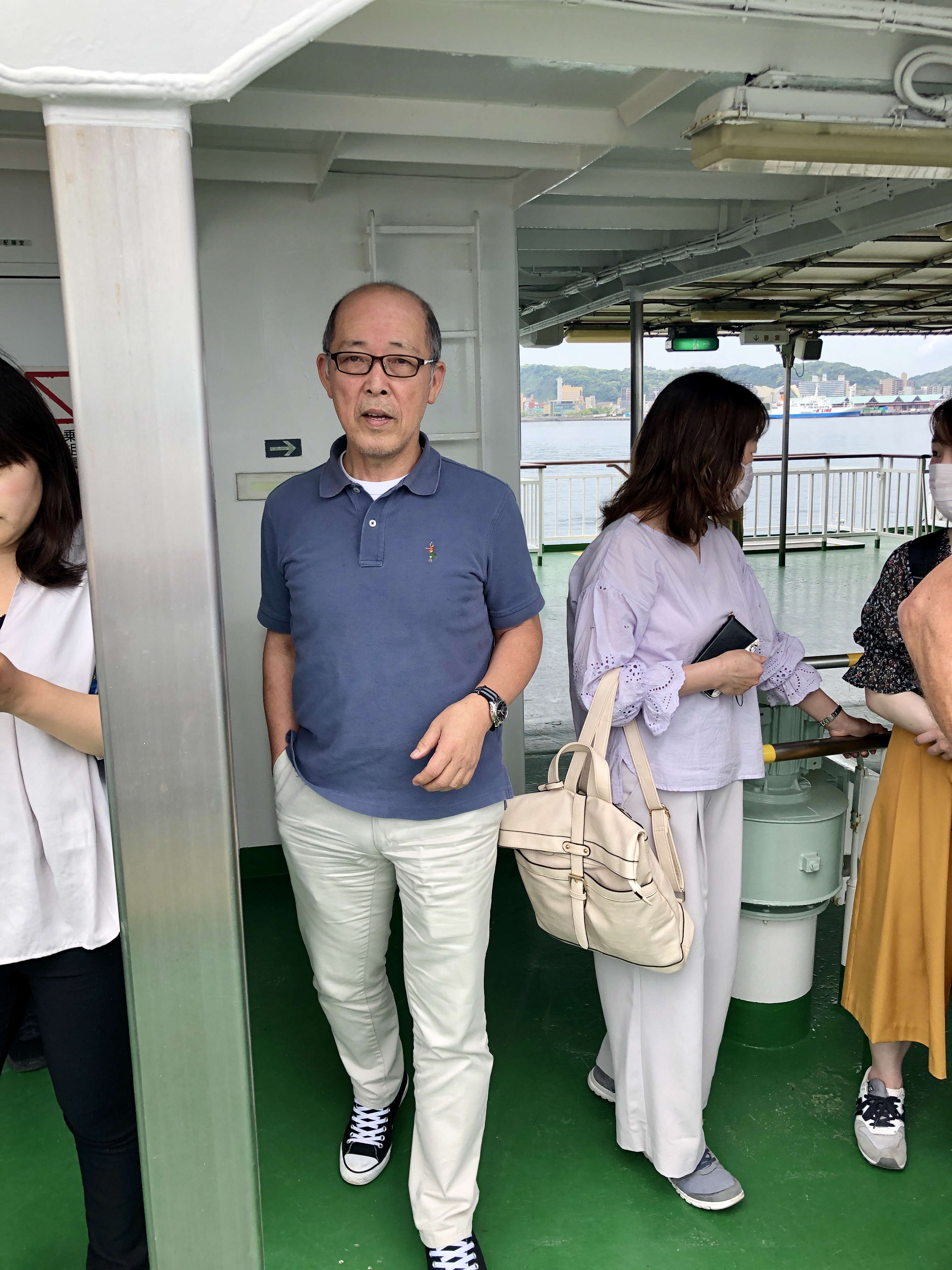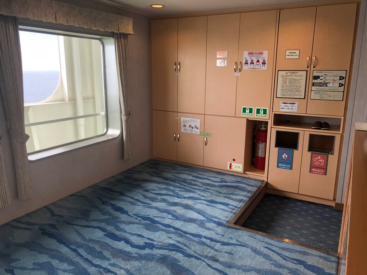Nästa morgon upp med tuppen. Taxi till hamnen i Usuki, färja till Yawatahama. En mycket behaglig och vacker tur på drygt 2 timmar. Återigen har vi vädret med oss, solen lyser från en klarblå himmel. På de färjor vi åkt, finns alltid en vilosektion. Här kan man hänga med hela sin familj eller själv, sova, läsa, äta etc, mycket smidigt. Man håller givetvis till på golvet.