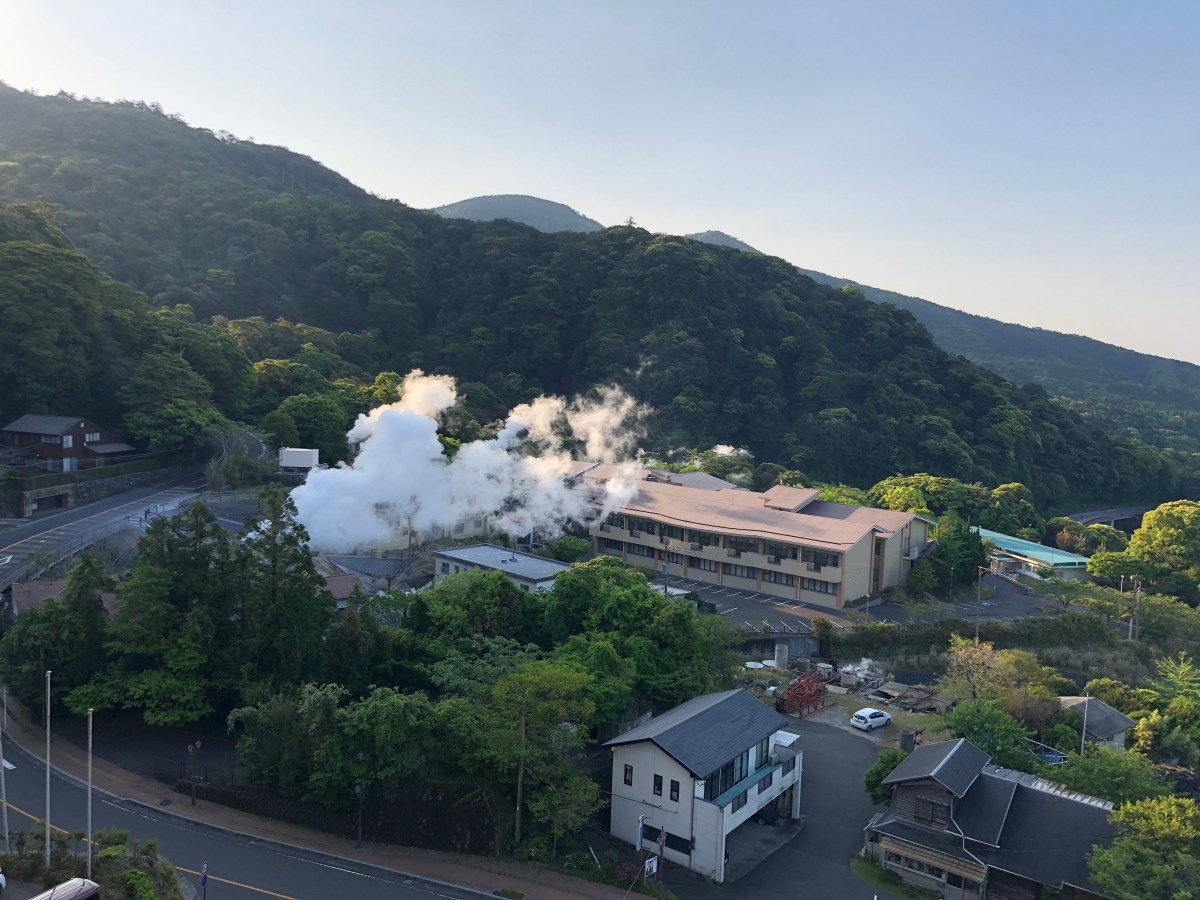 Denna morgon klev vi upp halv 7 för att säkert hinna med frukost innan vi tog taxin ner till stationen i Kirishima. Återigen en strålande vacker dag, med ånga som svävade trolskt över landskapet. Bergen är skogsbeklädda på ett sätt som påminner om regnskogen runt Matchu Pichu i Peru. Subtropisk regnskog?