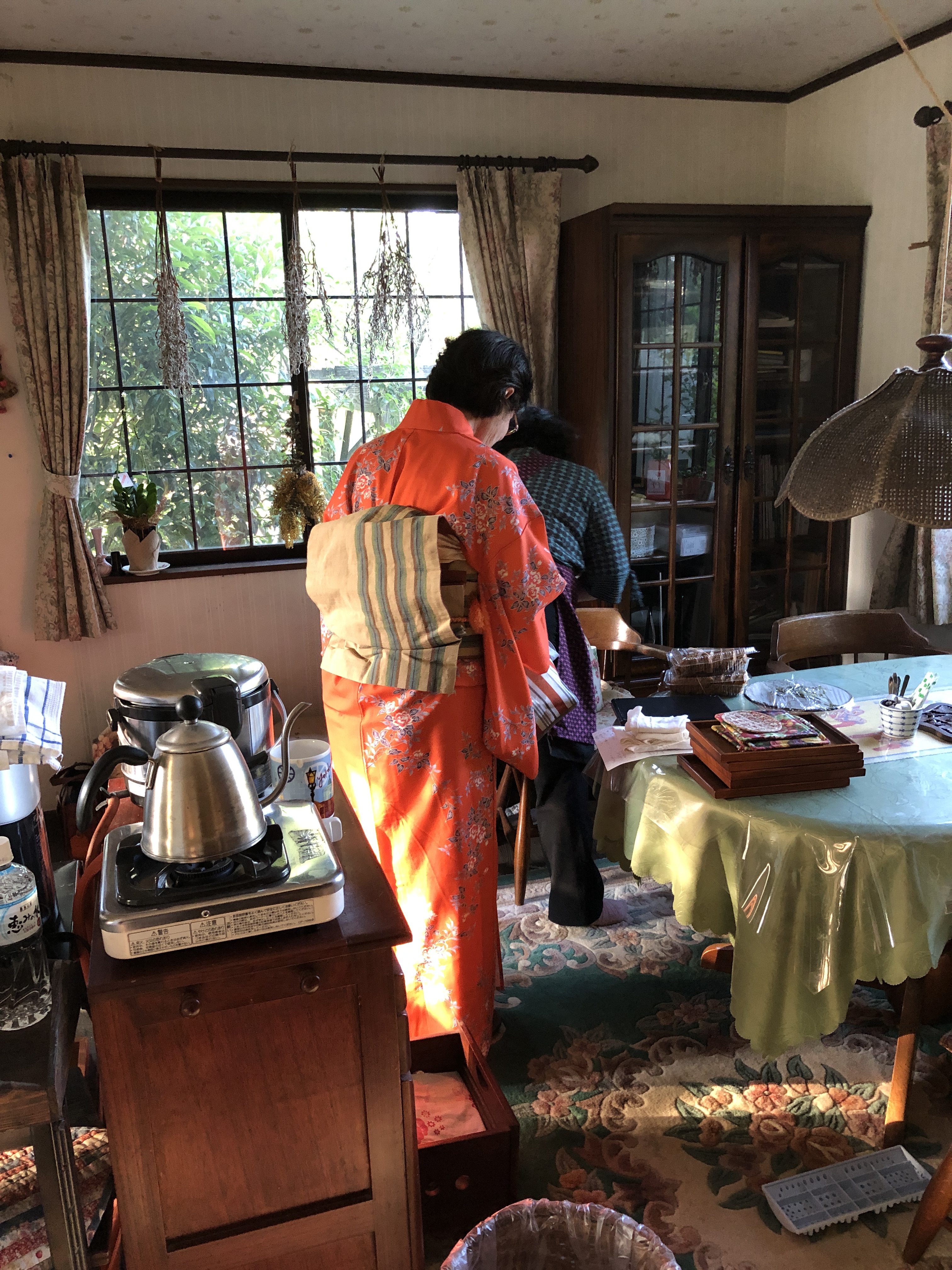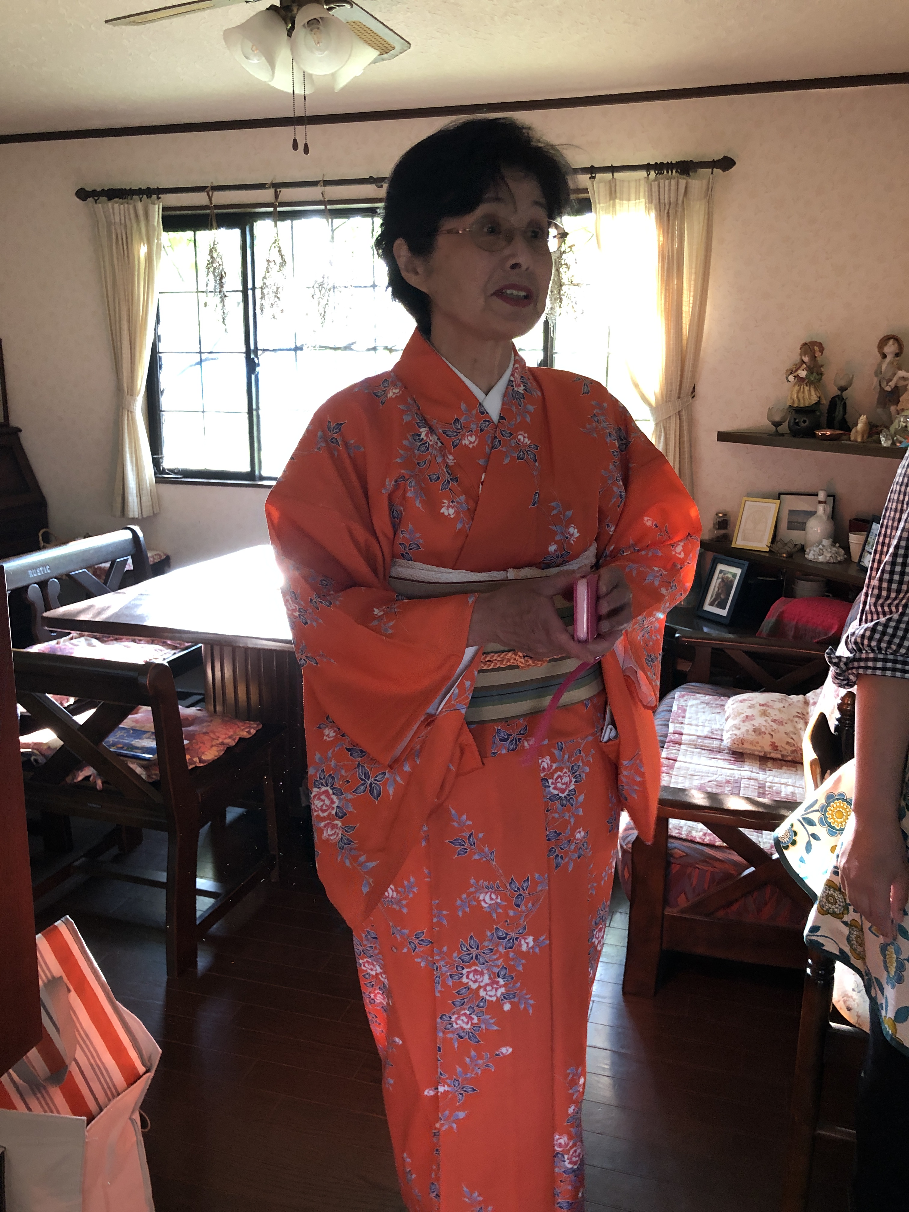 Vi blev också överraskade av att en väninna till Mrs Honda anlände, fullt uppklädd i kimono. Hon hade dessutom ett antal kimonos med sig, som vi fick välja mellan. Därefter klädde hon upp oss fullt ut och vi fick känna på hur andlöst en kimono sitter. Det är rätt många band och snören under som inte syns som ger den lediga looken! Jättekul, och om jag får säga det själv så passar jag utmärkt i kimono!