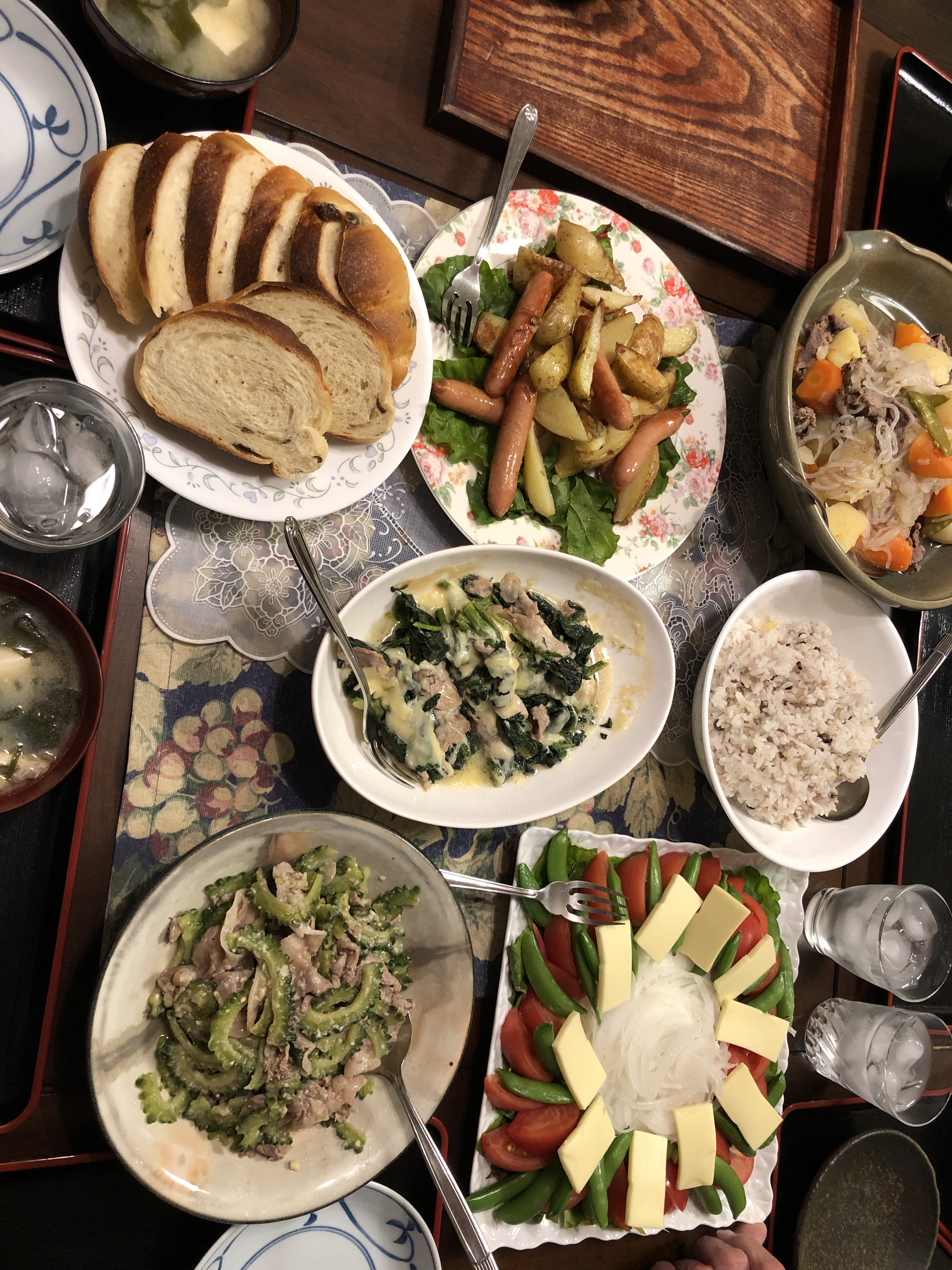 Riskokaren fylld med ris och grönsaker, hemgjord misopasta användes som smaksättare i maten jämte bonito (torkad fisk som rivs över en låda), bittermelon stektes med fläsk och miso, spenat med biff ostgratinerades. Vi fick också biffgryta med sötpotatis, morötter och lök, sallad med mangold, tomater och vårlök samt ost, stekt potatis och ”prinskorv”, hembakat bröd mm, ja det blev ingen liten middag idag heller! Och som grädde på moset, ett smakprov av japansk grönt te, maccha, ett pulver som vispas med en bambuvisp i hett vatten. Smakar gräs och vår och lämnar en lite bitter eftersmak