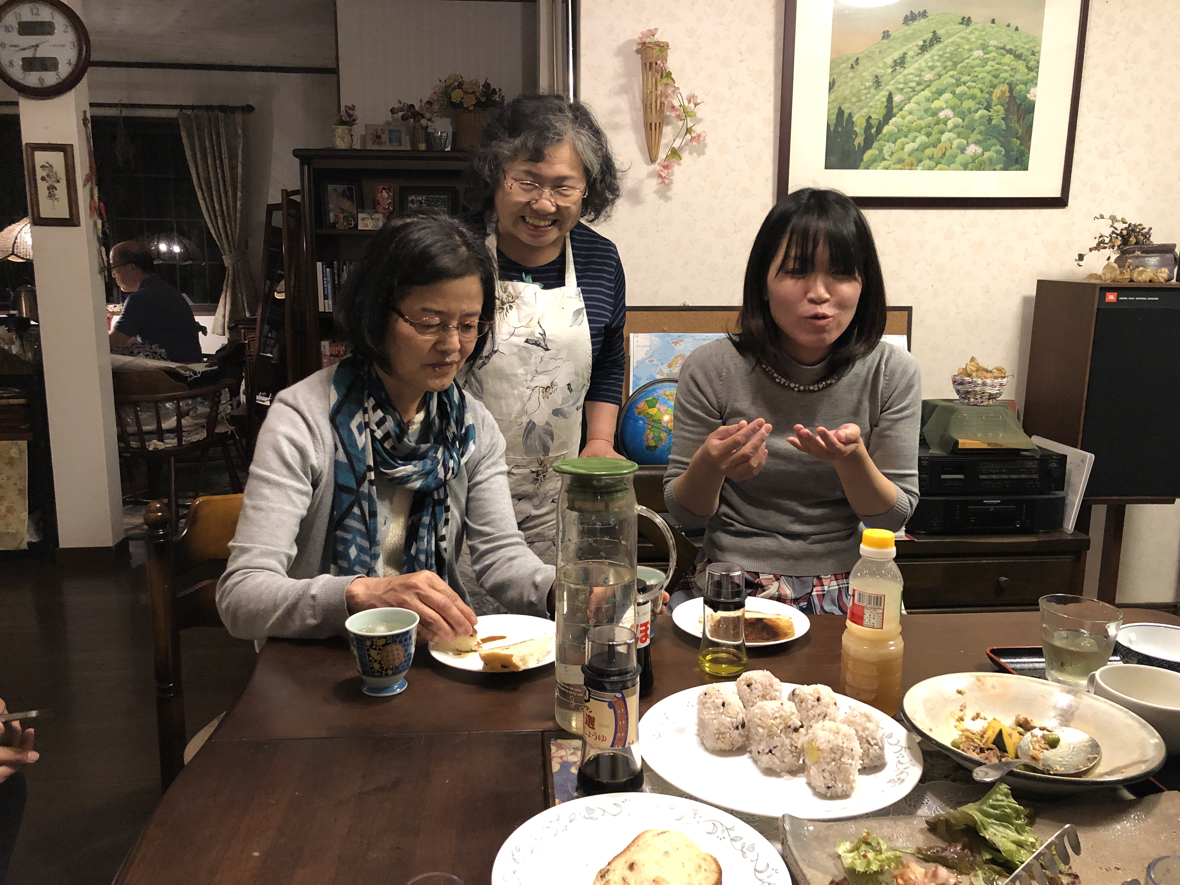 Hela dagen har också mrs Hondas unga väninna Yoki (tror jag döpte henne till något annat i förra inlägget…?) deltagit, hon hade en ledig dag och kunde lika väl hänga med oss! Hennes kompisar kom och hämtade henne (Hondas bor på landet och Yoki i stan), då fick vi tillfälle att lära dem äta bröd ”italian style”, olja och lite vinäger och doppa! Yummi!