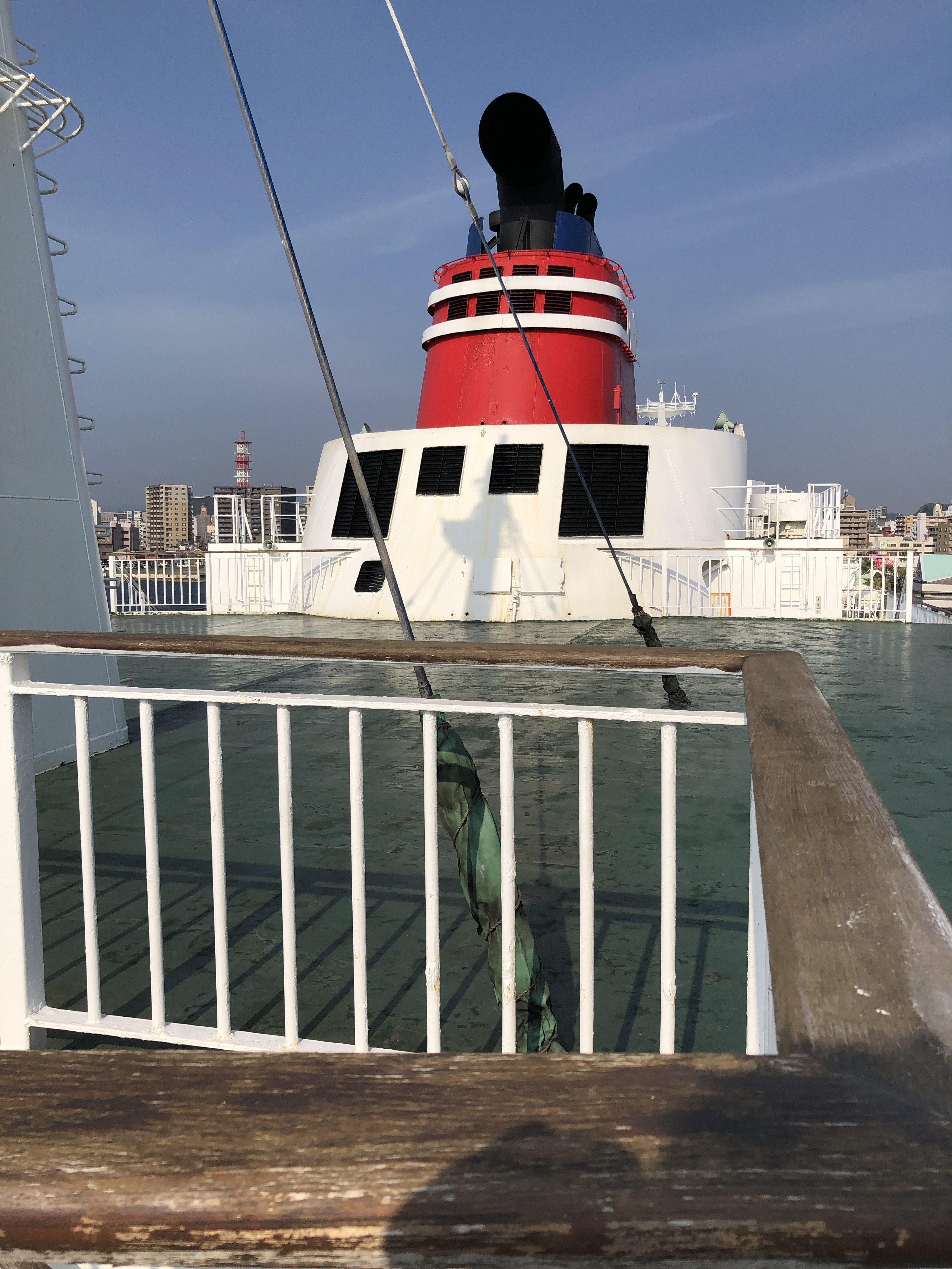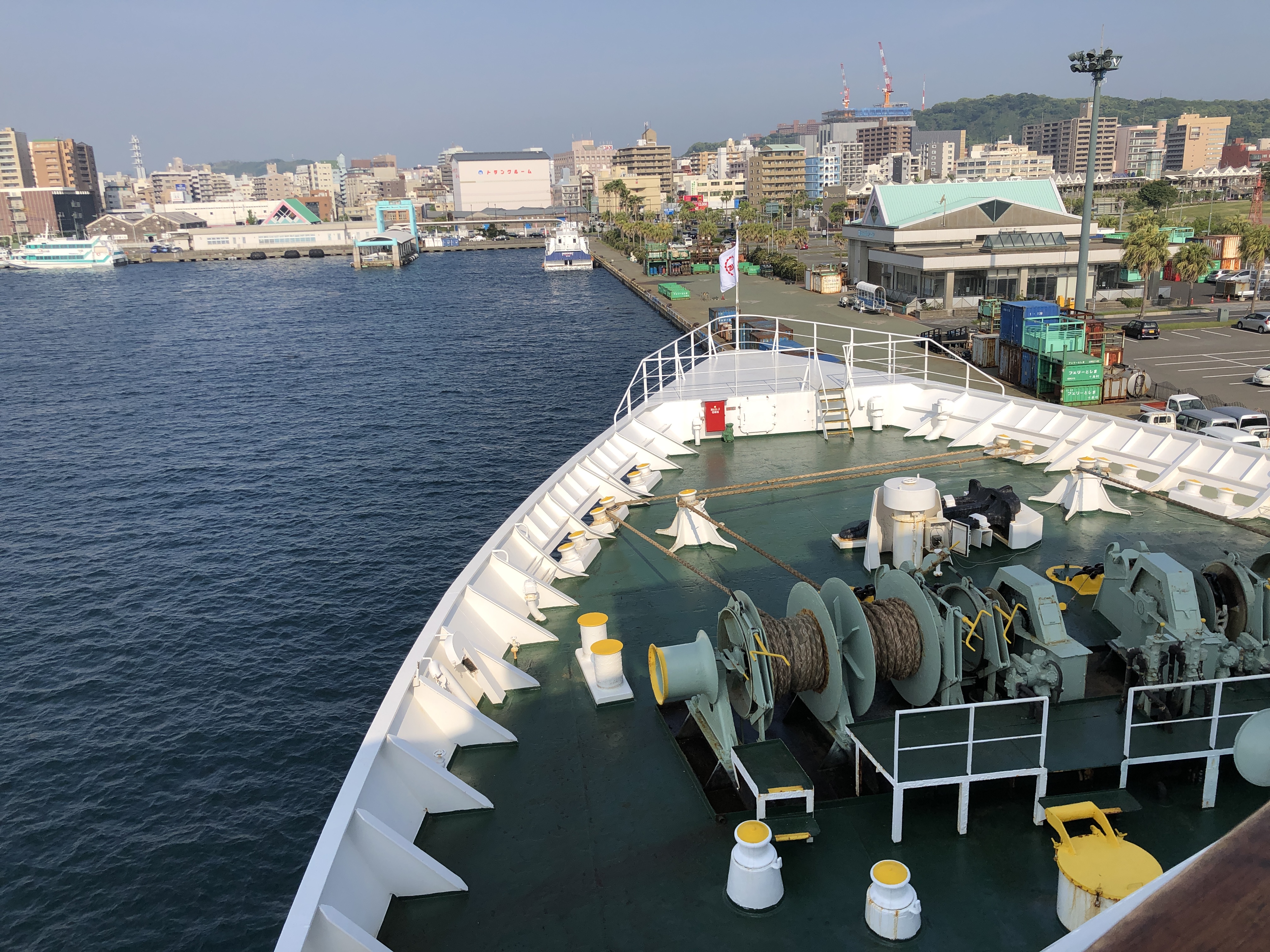 Vi tog snabbfärjan (bärplansbåt) till Kagoshima. Regnet hällde ner på Yakushima, man såg inget av de fantastiska bergen eller havet längre. Snabbfärjan tog ca 2 timmar. Man hade en fiffig tjänst på båten, en av personalen gick runt och frågade om man behövde taxi vid färjeterminalen i Kagoshima, om man sade ja, fick man ett rött papper med ett nummer. Väl framme väntade en gentleman med just vårt nummer på oss! Mycket smidigt!
