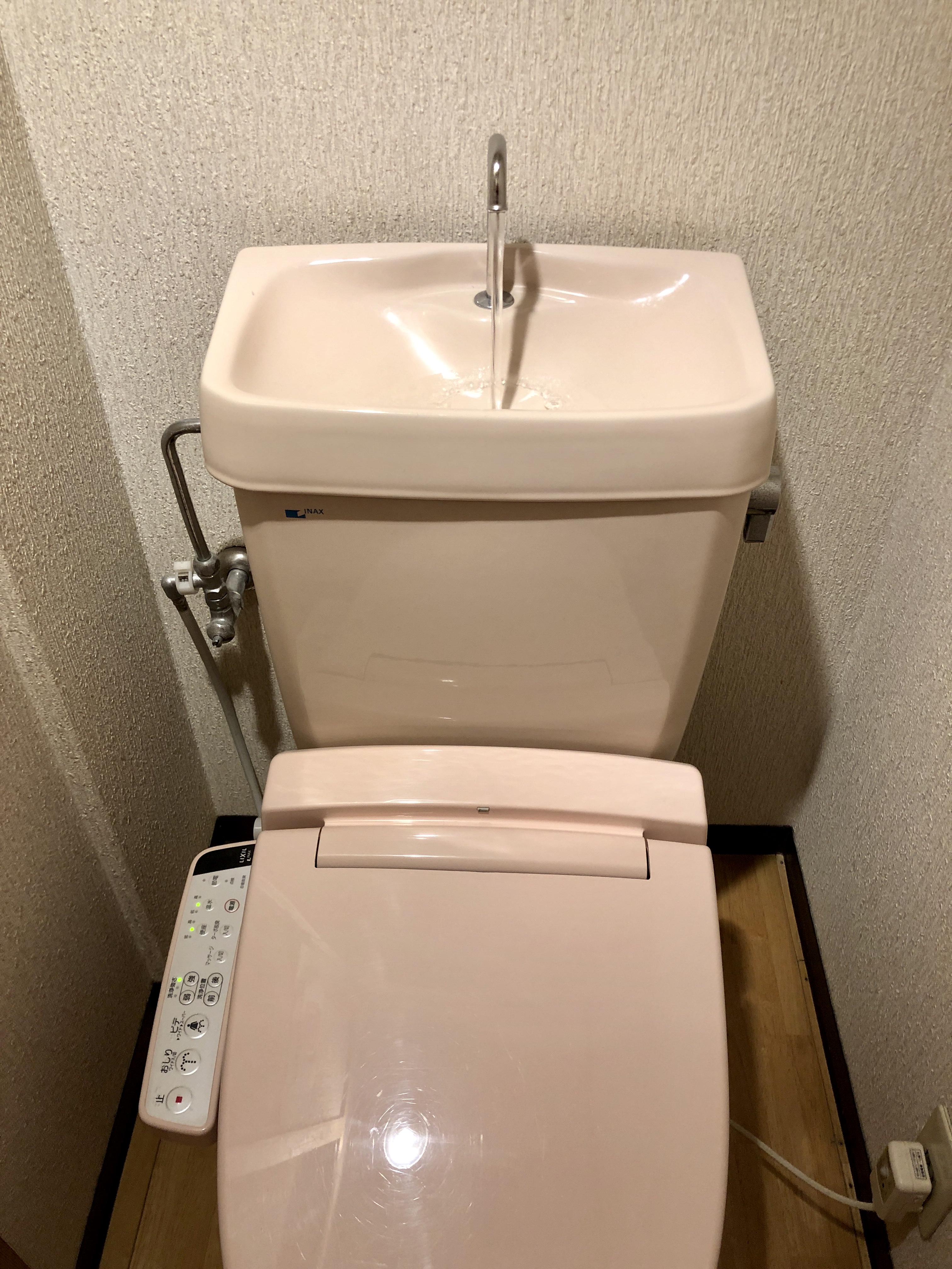 Vi steg upp kvart över sex, frukost serverades halv sju. Herr och fru Honda skjutsade oss till färjan och försedde oss med en påse bröd och kakor för att ha som snacks på resan. Efter ett kärleksfullt avsked (de var verkligen förtjusande människor) fick vi hjälp att bära upp bagaget på båten av personalen. Verkligen supersservice, då landgången var lång och brant! Sedan stävade vi ut ur hamnen och den stora bukten där Kagoshima ligger, ut på öppna havet. Solen sken, och det var verkligen väldigt vackert! En av bilderna nedan, visar en ståtoa (på tjejjernas alltså). Det finns alltid detta val, men jag hade hittills undvikit det. Men nöden har ju inte någon lag, så, ja ni vet… Och det går ju bra när man måste! Eftersom man utrustat faciliteten med handtag att dra sig upp med, så går det ju an! (och förresten när väl toa-saken är på tal, lägger även till en bild av toan på vandrarhemmet enligt nedan, toa och handfat i ett- hur praktiskt är inte det!!!)